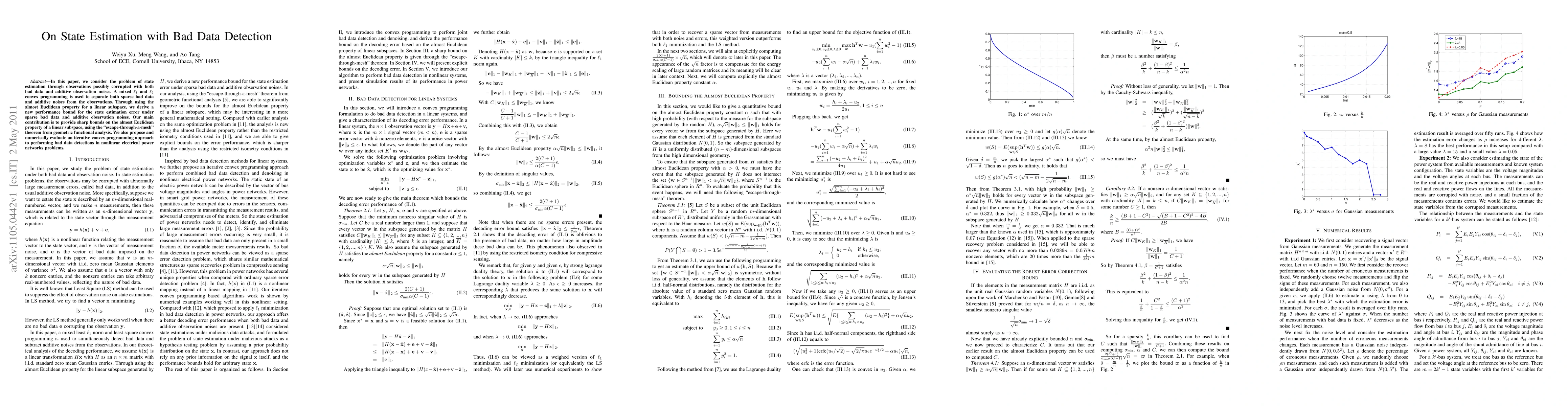 In this paper, we consider the problem of state estimation through observations possibly corrupted with both bad data and additive observation noises. A mixed $\ell_1$ and $\ell_2$ convex programming is used to separate both sparse bad data and additive noises from the observations. Through using the almost Euclidean property for a linear subspace, we derive a new performance bound for the state estimation error under sparse bad data and additive observation noises. Our main contribution is to provide sharp bounds on the almost Euclidean property of a linear subspace, using the "escape-through-a-mesh" theorem from geometric functional analysis. We also propose and numerically evaluate an iterative convex programming approach to performing bad data detections in nonlinear electrical power networks problems.