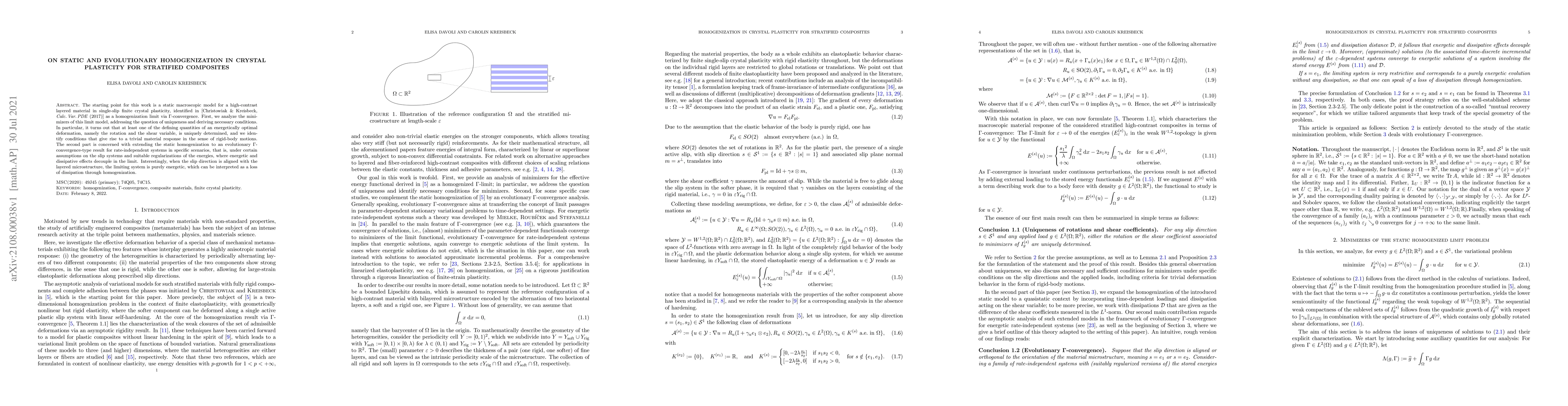 This paper investigates static and evolutionary homogenization in crystal plasticity for stratified composites, proving uniqueness of optimal deformations and identifying conditions leading to trivial material responses. It extends the static model to evolutionary scenarios, revealing a decoupling of energetic and dissipative effects, with aligned slip directions causing a loss of dissipation.
