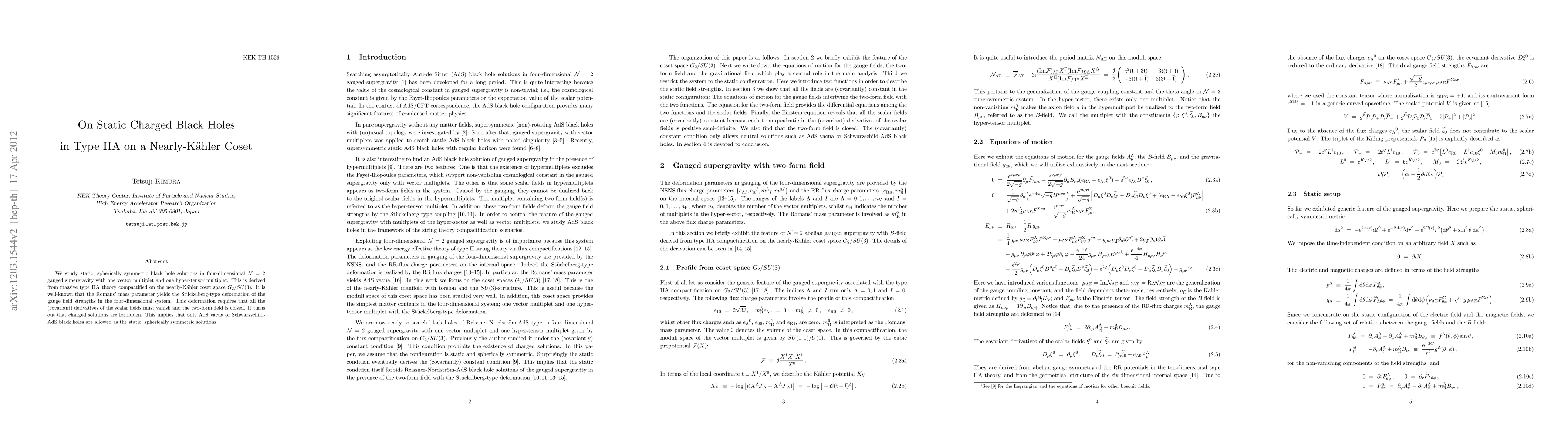 We study static, spherically symmetric black hole solutions in four-dimensional N=2 gauged supergravity with one vector multiplet and one hyper-tensor multiplet. This is derived from massive type IIA theory compactified on the nearly-Kahler coset space G2/SU(3). It is well-known that the Romans' mass parameter yields the Stuckelberg-type deformation of the gauge field strengths in the four-dimensional system. This deformation requires that all the (covariant) derivatives of the scalar fields must vanish and the two-form field is closed. It turns out that charged solutions are forbidden. This implies that only AdS vacua or Schwarzschild-AdS black holes are allowed as the static, spherically symmetric solutions.
