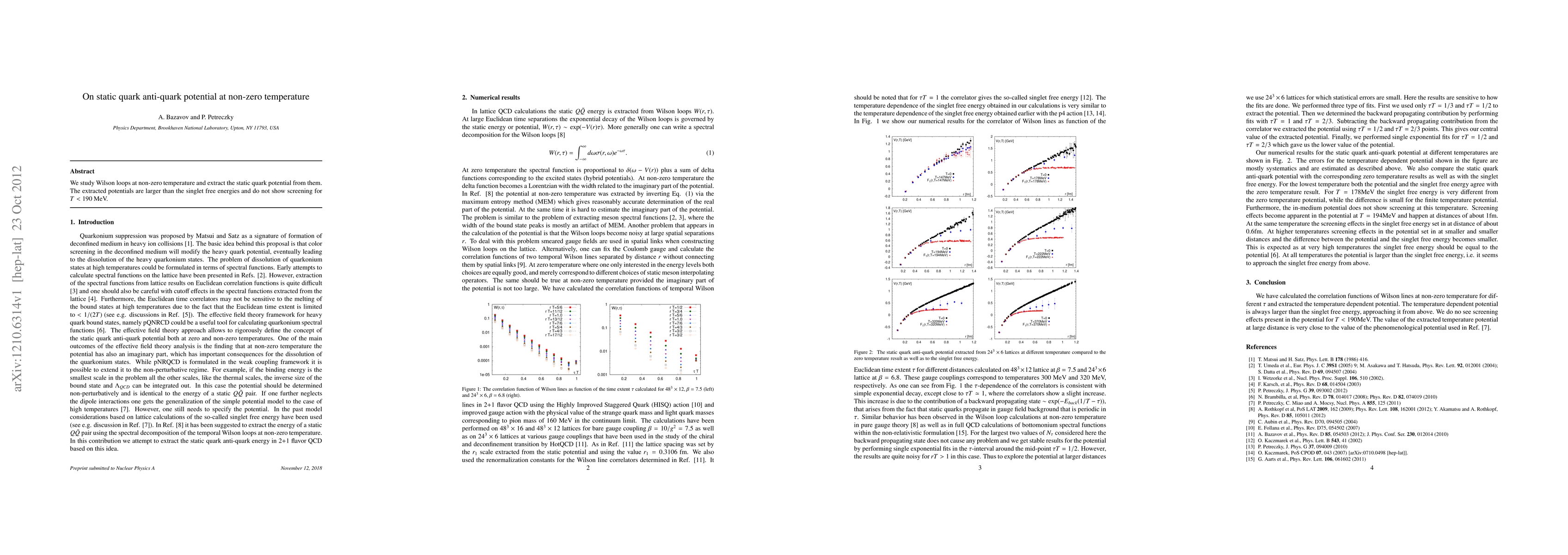 Summary: This study investigates the static quark-antiquark potential at non-zero temperatures using Wilson loops, revealing potentials larger than singlet free energies and no screening effects below $T<190$ MeV.