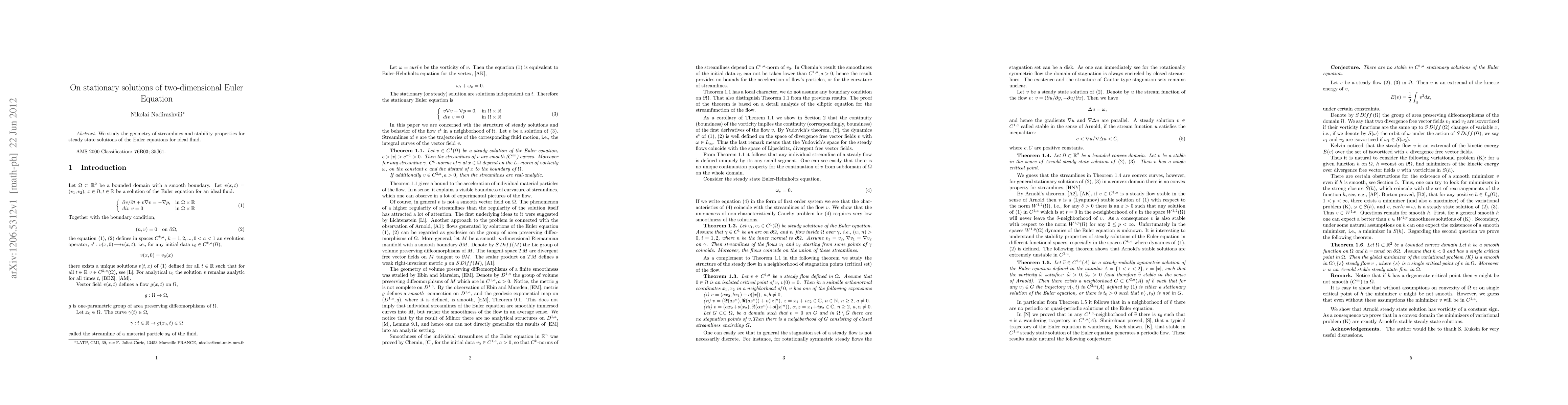 We study the geometry of streamlines and stability properties for steady state solutions of the Euler equations for ideal fluid.