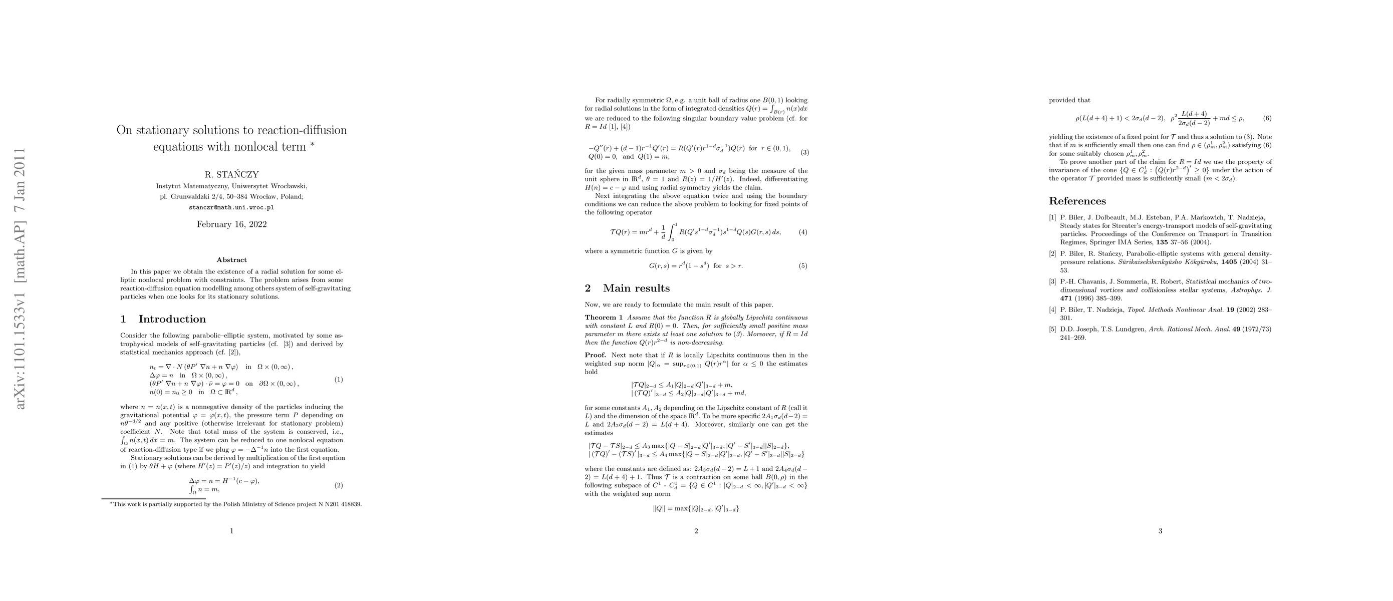 Summary: This paper establishes the existence of a radial solution for an elliptic nonlocal problem, which originates from a reaction-diffusion equation modeling self-gravitating particles. The focus is on finding stationary solutions to this system.