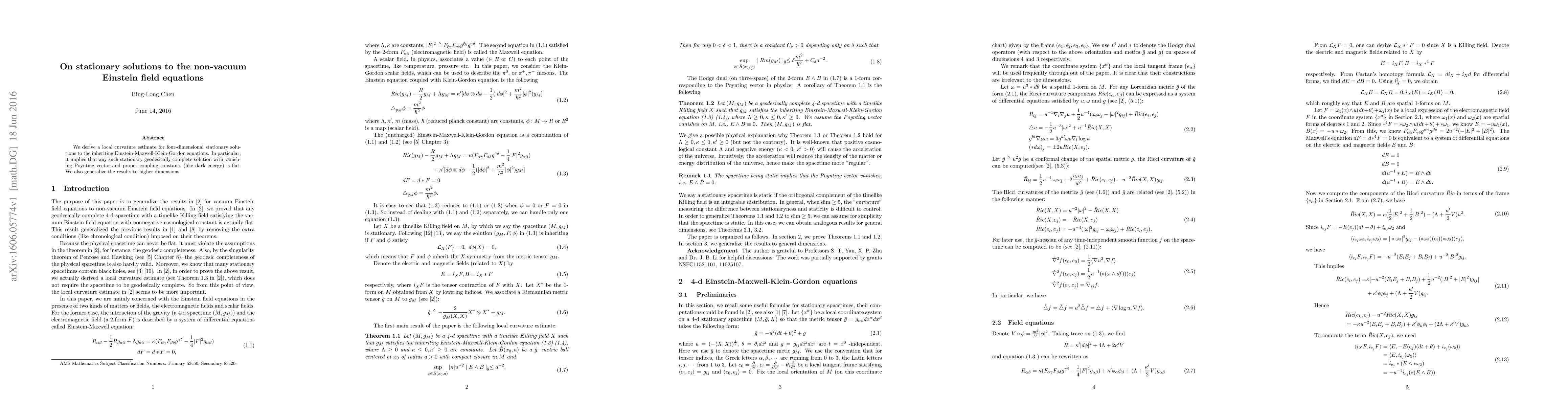 We derive a local curvature estimate for four-dimensional stationary solutions to the inheriting Einstein-Maxwell-Klein-Gordon equations. In particular, it implies that any such stationary geodesically complete solution with vanishing Poynting vector and proper coupling constants (like dark energy) is flat. We also generalize the result to higher dimensions.