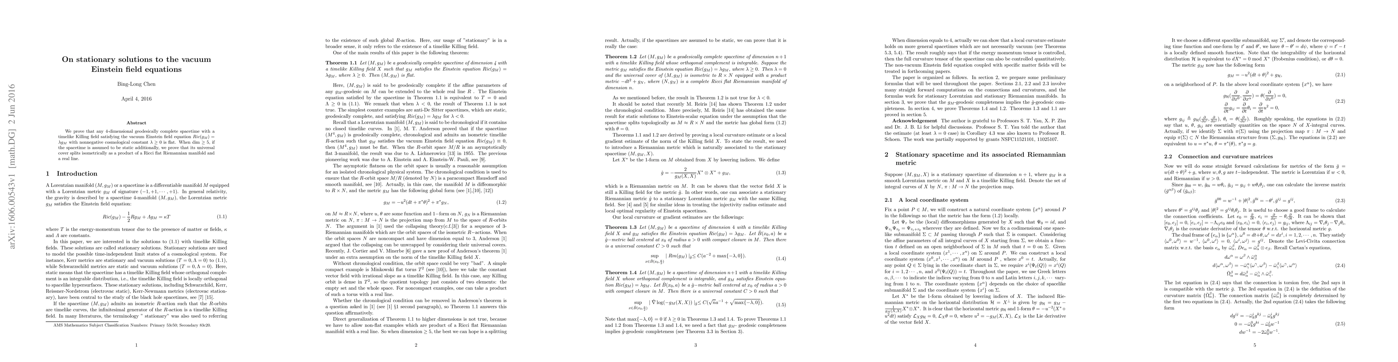 We prove that any 4-dimensional geodesically complete spacetime with a timelike Killing field satisfying the vacuum Einstein field equation $Ric(g_{M})=\lambda g_{M}$ with nonnegative cosmological constant $\lambda\geq 0$ is flat. When dim $\geq 5$, if the spacetime is assumed to be static additionally, we prove that its universal cover splits isometrically as a product of a Ricci flat Riemannian manifold and a real line.