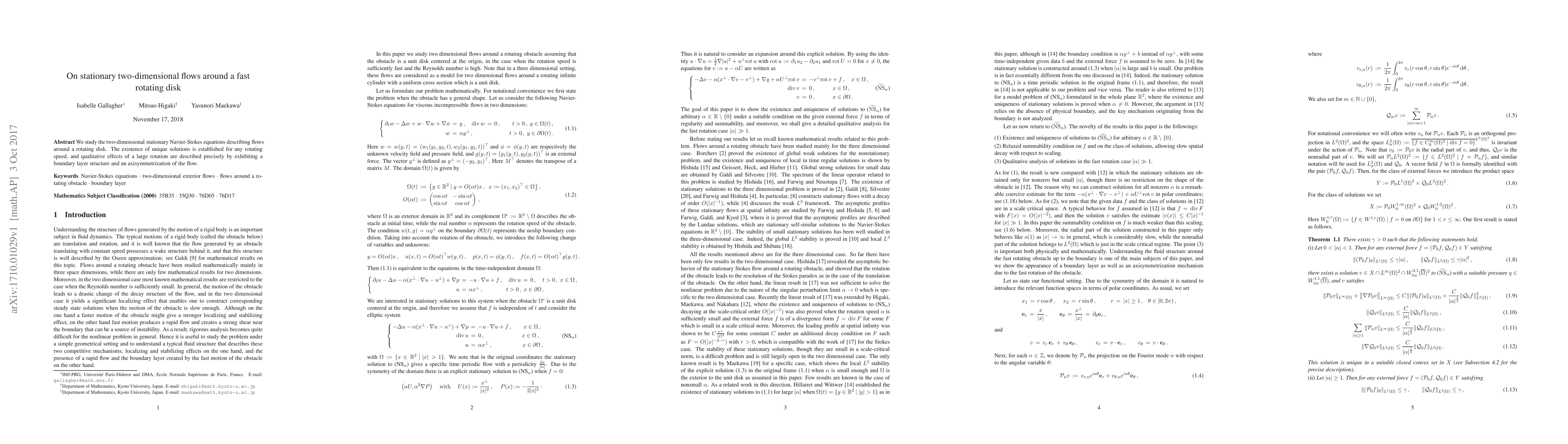 Researchers studied stationary Navier-Stokes equations for flows around a rotating disk, establishing unique solutions for any rotation speed and highlighting a boundary layer structure with axisymmetrization of the flow.