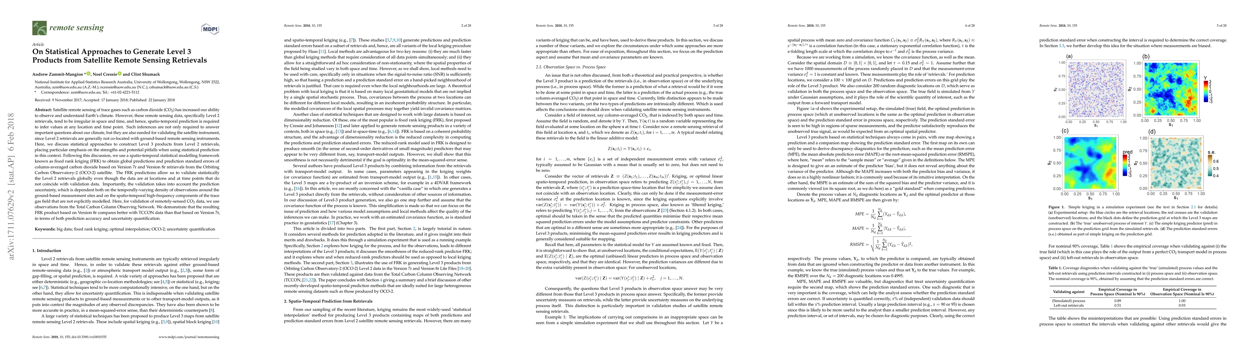 Satellite remote sensing of trace gases such as carbon dioxide (CO$_2$) has increased our ability to observe and understand Earth's climate. However, these remote sensing data, specifically~Level 2 retrievals, tend to be irregular in space and time, and hence, spatio-temporal prediction is required to infer values at any location and time point. Such inferences are not only required to answer important questions about our climate, but they are also needed for validating the satellite instrument, since Level 2 retrievals are generally not co-located with ground-based remote sensing instruments. Here, we discuss statistical approaches to construct Level 3 products from Level 2 retrievals, placing particular emphasis on the strengths and potential pitfalls when using statistical prediction in this context. Following this discussion, we use a spatio-temporal statistical modelling framework known as fixed rank kriging (FRK) to obtain global predictions and prediction standard errors of column-averaged carbon dioxide based on Version 7r and Version 8r retrievals from the Orbiting Carbon Observatory-2 (OCO-2) satellite. The FRK predictions allow us to validate statistically the Level 2 retrievals globally even though the data are at locations and at time points that do not coincide with validation data. Importantly, the validation takes into account the prediction uncertainty, which is dependent both on the temporally-varying density of observations around the ground-based measurement sites and on the spatio-temporal high-frequency components of the trace gas field that are not explicitly modelled. Here, for validation of remotely-sensed CO$_2$ data, we use observations from the Total Carbon Column Observing Network. We demonstrate that the resulting FRK product based on Version 8r compares better with TCCON data than that based on Version 7r.