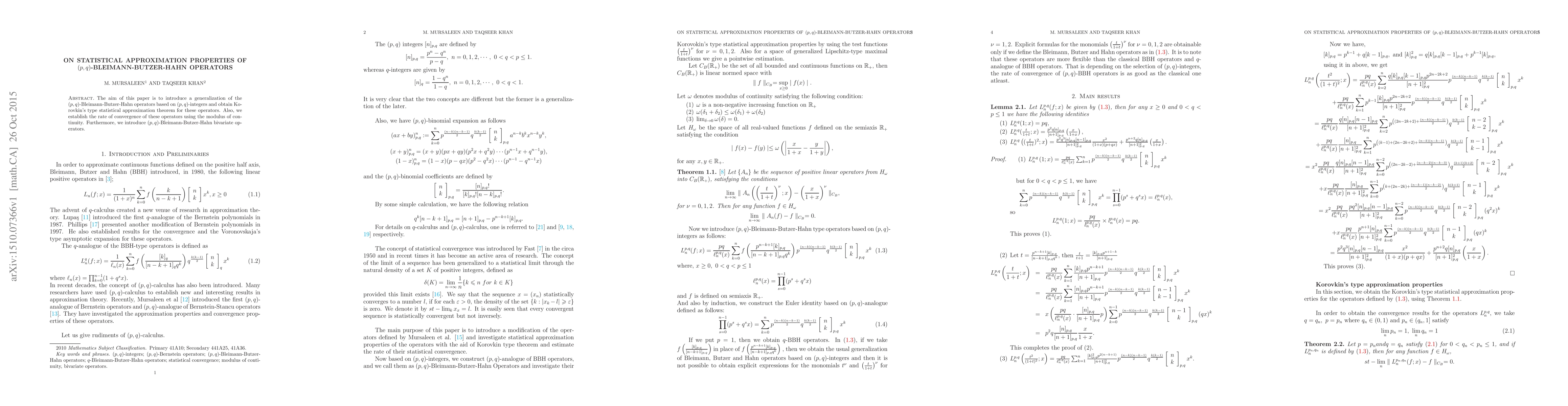 This paper introduces generalized (p,q)-Bleimann-Butzer-Hahn operators and establishes a statistical approximation theorem with Korovkin's type convergence rate, improving our understanding of these mathematical tools.