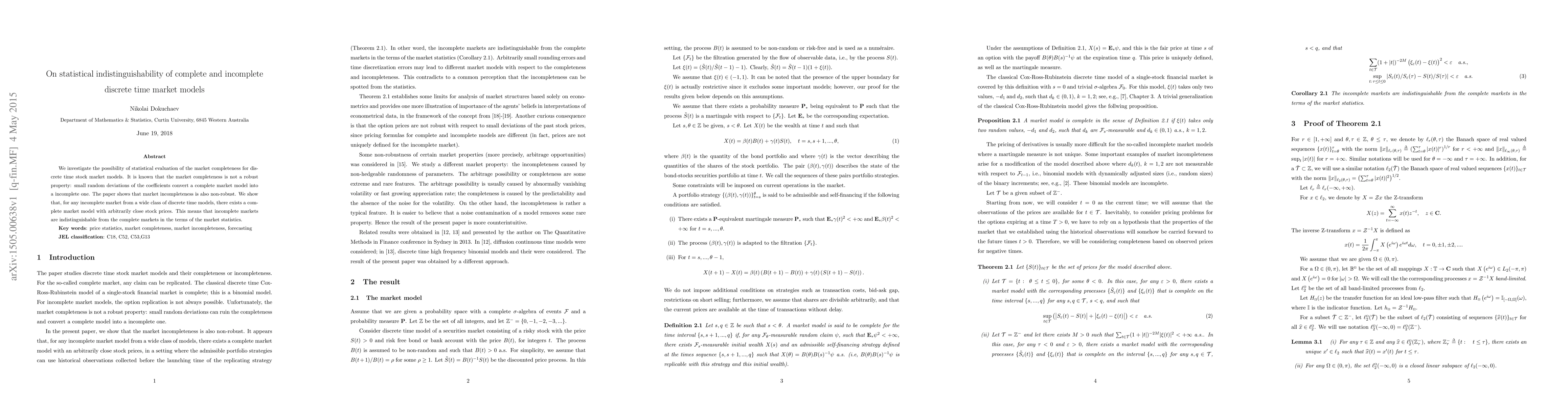 This paper explores the statistical indistinguishability of complete and incomplete discrete time market models, demonstrating that small random deviations can render complete markets incomplete, and conversely, incomplete markets can have stock prices arbitrarily close to those of complete markets, indicating their statistical indistinguishability.