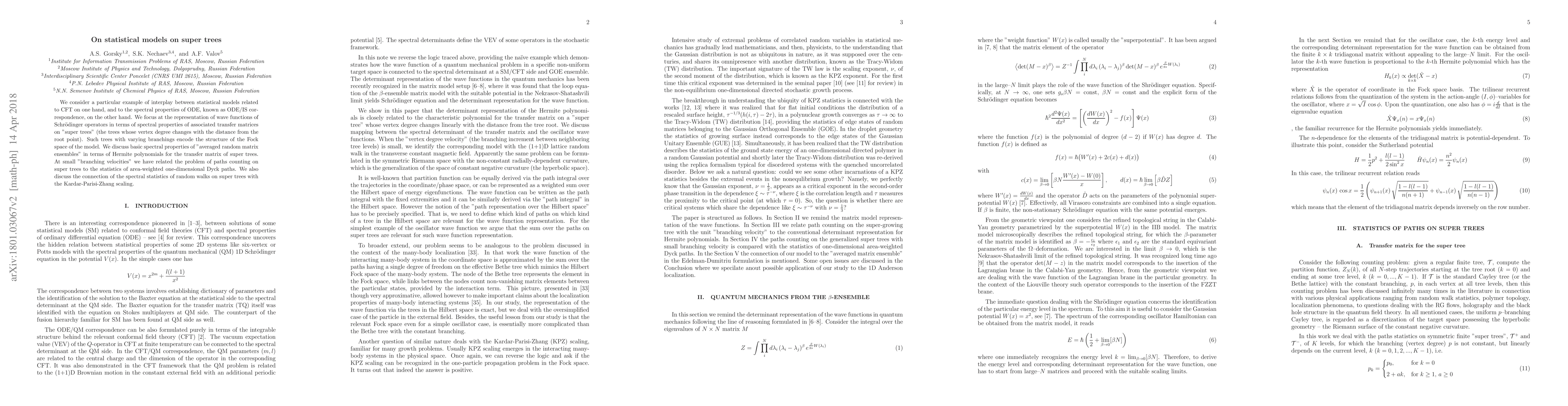 We consider a particular example of interplay between statistical models related to CFT on one hand, and to the spectral properties of ODE, known as ODE/IS correspondence, on the other hand. We focus at the representation of wave functions of Schr\"odinger operators in terms of spectral properties of associated transfer matrices on "super trees" (the trees whose vertex degree changes with the distance from the root point). Such trees with varying branchings encode the structure of the Fock space of the model. We discuss basic spectral properties of "averaged random matrix ensembles" in terms of Hermite polynomials for the transfer matrix of super trees. At small "branching velocities" we have related the problem of paths counting on super trees to the statistics of area-weighted one-dimensional Dyck paths. We also discuss the connection of the spectral statistics of random walks on super trees with the Kardar-Parisi-Zhang scaling.