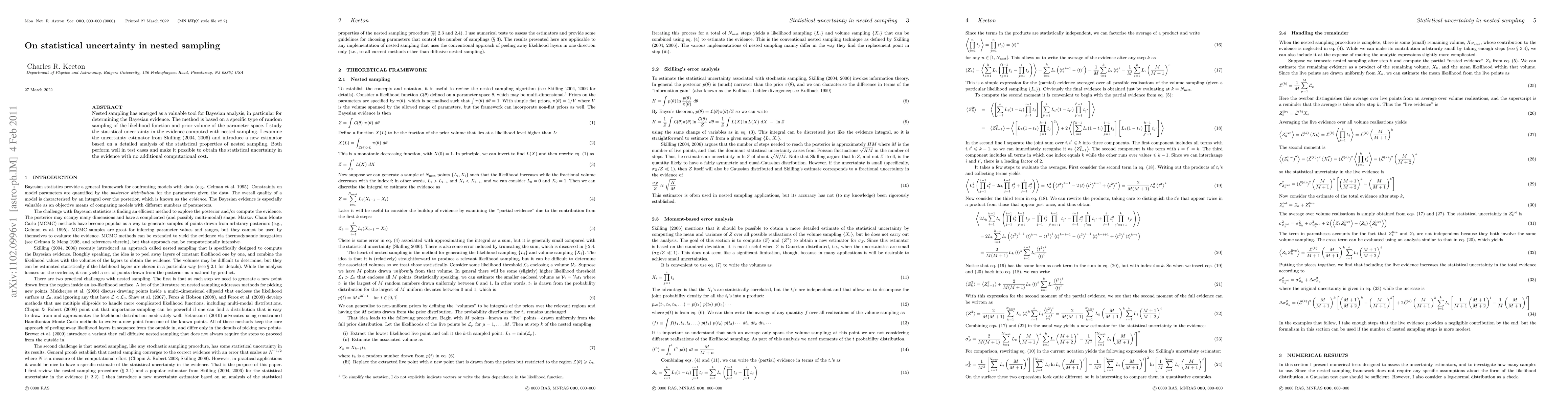 This paper investigates the statistical uncertainty in Bayesian evidence computed using nested sampling, evaluating both the existing Skilling estimator and a newly proposed method. Both estimators show good performance in test cases and provide uncertainty estimates without additional computational costs.
