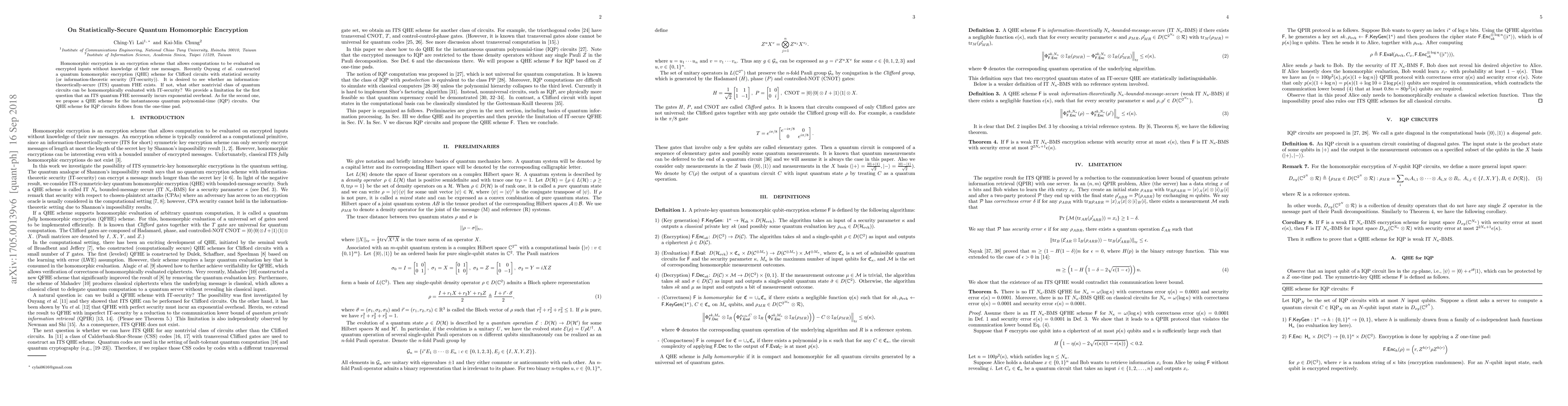 Homomorphic encryption is an encryption scheme that allows computations to be evaluated on encrypted inputs without knowledge of their raw messages. Recently Ouyang et al. constructed a quantum homomorphic encryption (QHE) scheme for Clifford circuits with statistical security (or information-theoretic security (IT-security)). It is desired to see whether an information-theoretically-secure (ITS) quantum FHE exists. If not, what other nontrivial class of quantum circuits can be homomorphically evaluated with IT-security? We provide a limitation for the first question that an ITS quantum FHE necessarily incurs exponential overhead. As for the second one, we propose a QHE scheme for the instantaneous quantum polynomial-time (IQP) circuits. Our QHE scheme for IQP circuits follows from the one-time pad.
