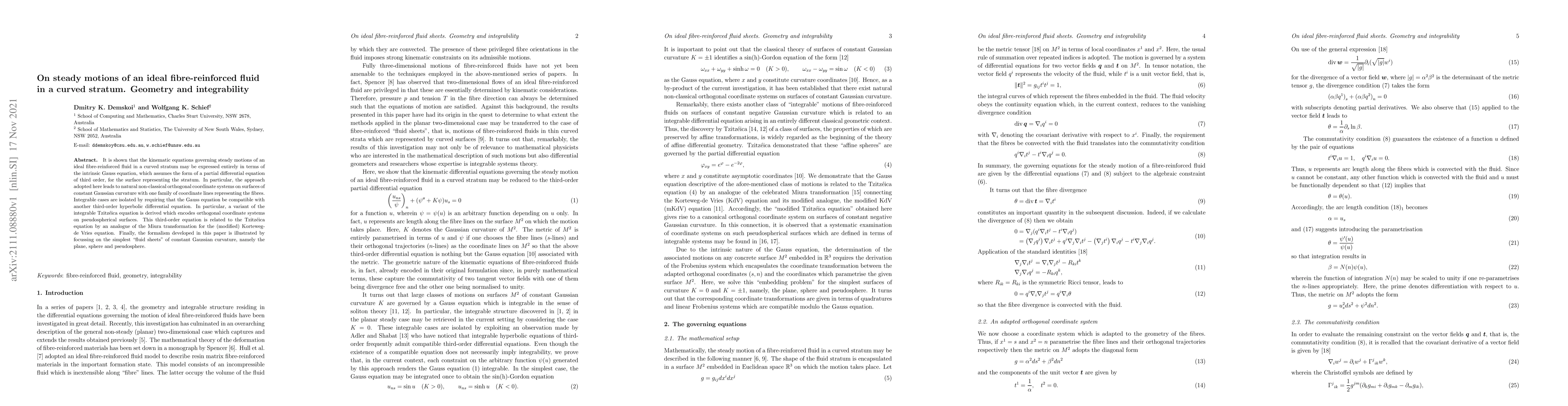 It is shown that the kinematic equations governing steady motions of an ideal fibre-reinforced fluid in a curved stratum may be expressed entirely in terms of the intrinsic Gauss equation, which assumes the form of a partial differential equation of third order, for the surface representing the stratum. In particular, the approach adopted here leads to natural non-classical orthogonal coordinate systems on surfaces of constant Gaussian curvature with one family of coordinate lines representing the fibres. Integrable cases are isolated by requiring that the Gauss equation be compatible with another third-order hyperbolic differential equation. In particular, a variant of the integrable Tzitz\'eica equation is derived which encodes orthogonal coordinate systems on pseudospherical surfaces. This third-order equation is related to the Tzitz\'eica equation by an analogue of the Miura transformation for the (modified) Korteweg-de Vries equation. Finally, the formalism developed in this paper is illustrated by focussing on the simplest ``fluid sheets'' of constant Gaussian curvature, namely the plane, sphere and pseudosphere.