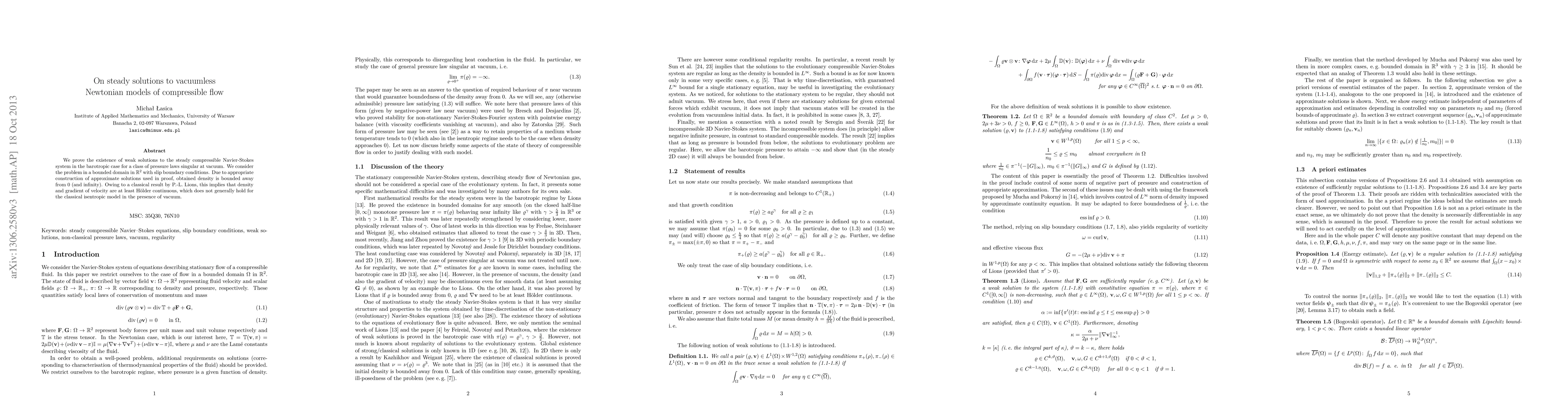 This paper proves the existence of steady solutions to vacuumless compressible flow models with certain pressure laws, showing that density remains bounded away from zero. This result implies that such solutions can be more robustly analyzed than in classical isentropic models.