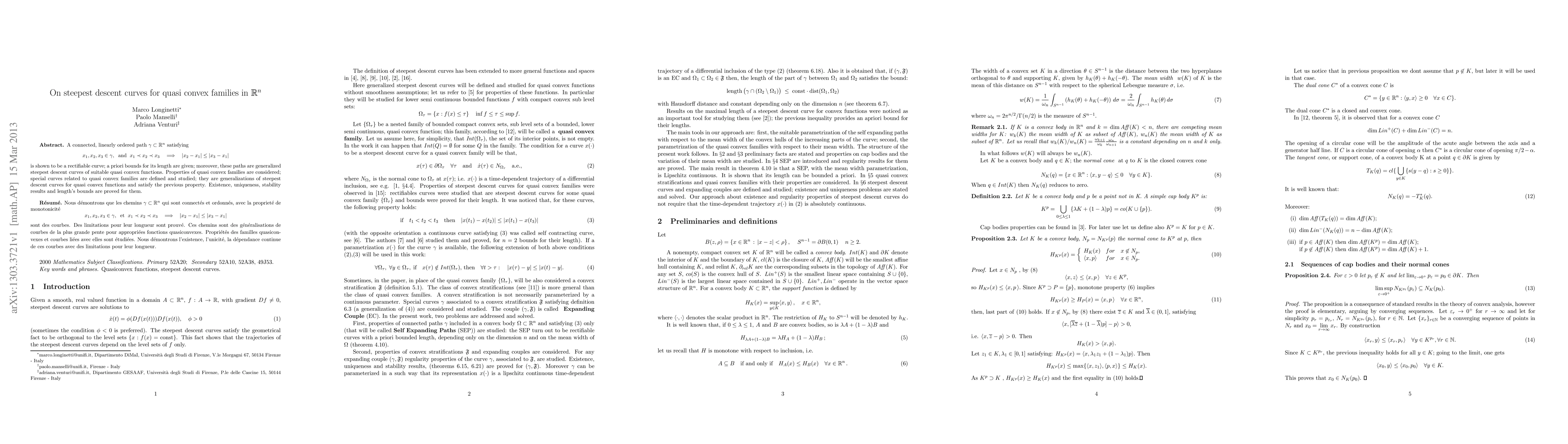 A connected, linearly ordered path $\ga \subset R^n$ satisfying $$ x_1\prec x_2\prec x_3 \in \ga, and x_1 \prec x_2 \prec x_3 \Rightarrow |x_2 - x_1| \leq | x_3 - x_1|$$ is shown to be a rectifiable curve; a priori bounds for its length are given; moreover, these paths are generalized steepest descent curves of suitable quasi convex functions. Properties of quasi convex families are considered; special curves related to quasi convex families are defined and studied; they are generalizations of steepest descent curves for quasi convex functions and satisfy the previous property. Existence, uniqueness, stability results and length's bounds are proved for them.