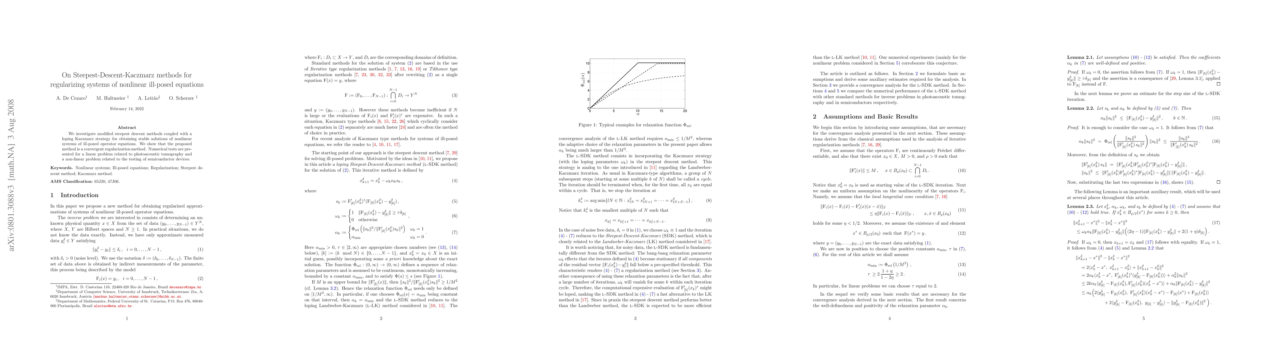 This paper proposes modified steepest descent methods combined with a Kaczmarz strategy to stabilize solutions for nonlinear ill-posed operator equations. The authors demonstrate the convergence of the method and provide numerical tests for both a linear photoacoustic tomography problem and a nonlinear semiconductor device testing problem.