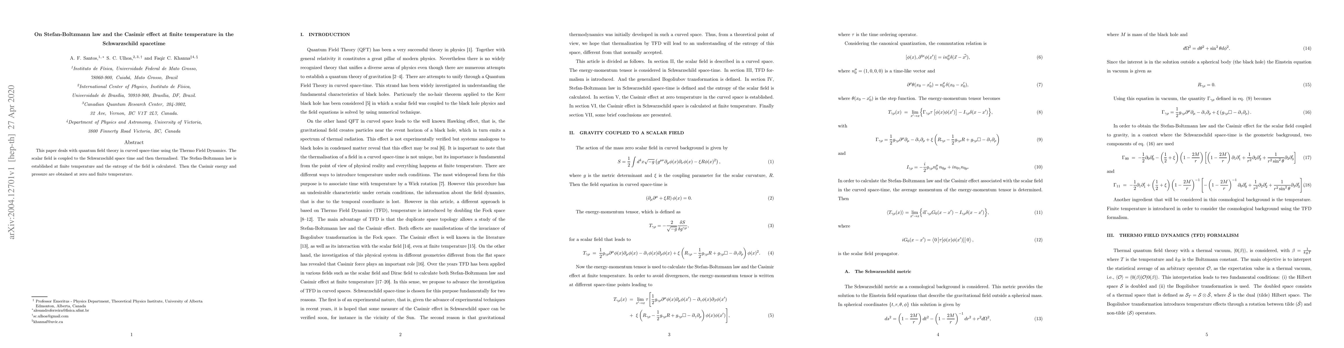 This paper employs Thermo Field Dynamics to study a scalar field in Schwarzschild spacetime, establishing the Stefan-Boltzmann law at finite temperature and calculating the entropy, Casimir energy, and pressure both at zero and finite temperatures.
