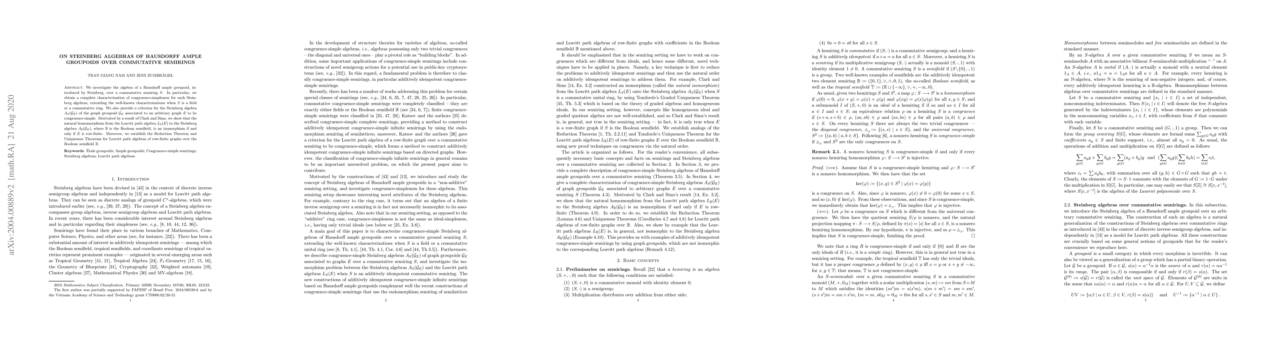 We investigate the algebra of a Hausdorff ample groupoid, introduced by Steinberg, over a commutative semiring S. In particular, we obtain a complete characterization of congruence-simpleness for such Steinberg algebras, extending the well-known characterizations when S is a field or a commutative ring. We also provide a criterion for the Steinberg algebra of the graph groupoid associated to an arbitrary graph to be congruence-simple. Motivated by a result of Clark and Sims, we show that, over the Boolean semifield, the natural homomorphism from the Leavitt path algebra to the Steinberg algebra is an isomorphism if and only if the associated graph is row-finite. Moreover, we establish the Reduction Theorem and Uniqueness Theorems for Leavitt path algebras of row-finite graphs over the Boolean semifield.