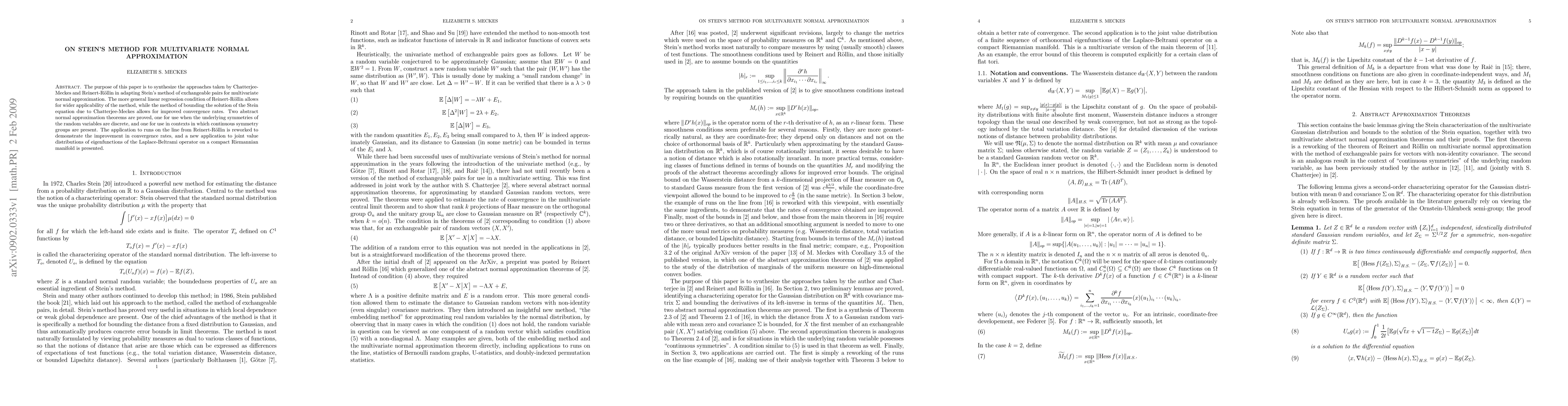 The purpose of this paper is to synthesize the approaches taken by Chatterjee-Meckes and Reinert-R\"ollin in adapting Stein's method of exchangeable pairs for multivariate normal approximation. The more general linear regression condition of Reinert-R\"ollin allows for wider applicability of the method, while the method of bounding the solution of the Stein equation due to Chatterjee-Meckes allows for improved convergence rates. Two abstract normal approximation theorems are proved, one for use when the underlying symmetries of the random variables are discrete, and one for use in contexts in which continuous symmetry groups are present. The application to runs on the line from Reinert-R\"ollin is reworked to demonstrate the improvement in convergence rates, and a new application to joint value distributions of eigenfunctions of the Laplace-Beltrami operator on a compact Riemannian manifold is presented.