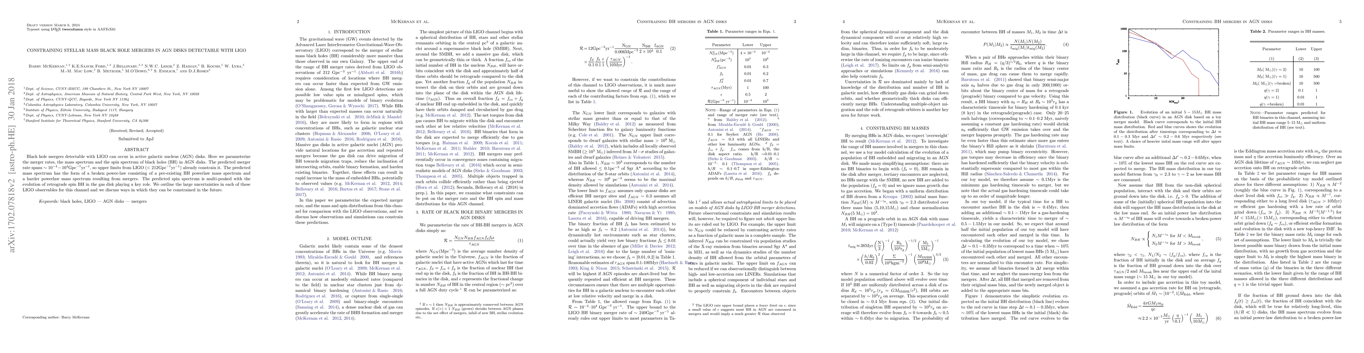 Black hole mergers detectable with LIGO can occur in active galactic nucleus (AGN) disks. Here we parameterize the merger rates, the mass spectrum and the spin spectrum of black holes (BH) in AGN disks. The predicted merger rate spans $\sim 10^{-4}-10^{4} \rm{Gpc}^{-1} \rm{yr}^{-1}$, so upper limits from LIGO ($<212\rm{Gpc}^{-1}\rm{yr}^{-1}$) already constrain it. The predicted mass spectrum has the form of a broken power-law consisting of a pre-existing BH powerlaw mass spectrum and a harder powerlaw mass spectrum resulting from mergers. The predicted spin spectrum is multi-peaked with the evolution of retrograde spin BH in the gas disk playing a key role. We outline the large uncertainties in each of these LIGO observables for this channel and we discuss ways in which they can be constrained in the future.