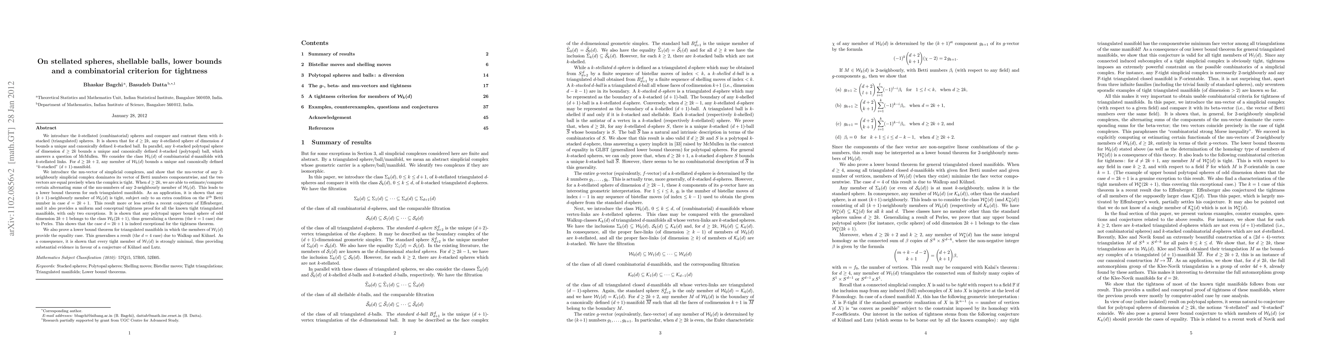 This paper explores the relationship between $k$-stellated and $k$-stacked spheres, proving that certain dimensions uniquely bound $k$-stacked balls. It introduces the mu-vector of simplicial complexes and uses it to derive a lower bound theorem for triangulated manifolds, proving tightness for $(k+1)$-neighbourly members under specific conditions. The study generalizes previous tightness results and resolves a conjecture by Effenberger.