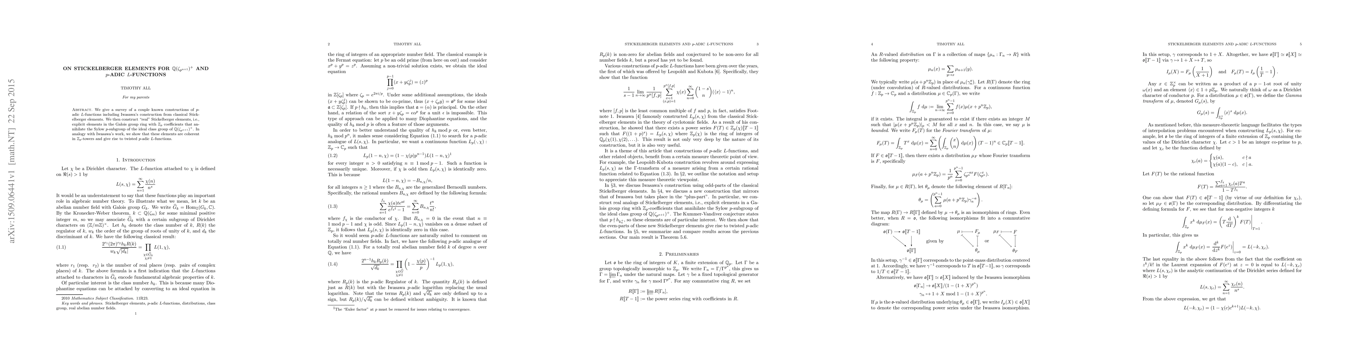 We give a survey of a couple known constructions of $p$-adic $L$-functions including Iwasawa's construction from classical Stickelberger elements. We then construct "real" Stickelberger elements, i.e., explicit elements in the Galois group ring with $\mathbb{Z}_p$ coefficients that annihilate the Sylow $p$-subgroup of the ideal class group of $\mathbb{Q}(\zeta_{p^{n+1}})^+$. In analogy with Iwasawa's work, we show that these elements are coherent in $\mathbb{Z}_p$-towers and give rise to twisted $p$-adic $L$-functions.