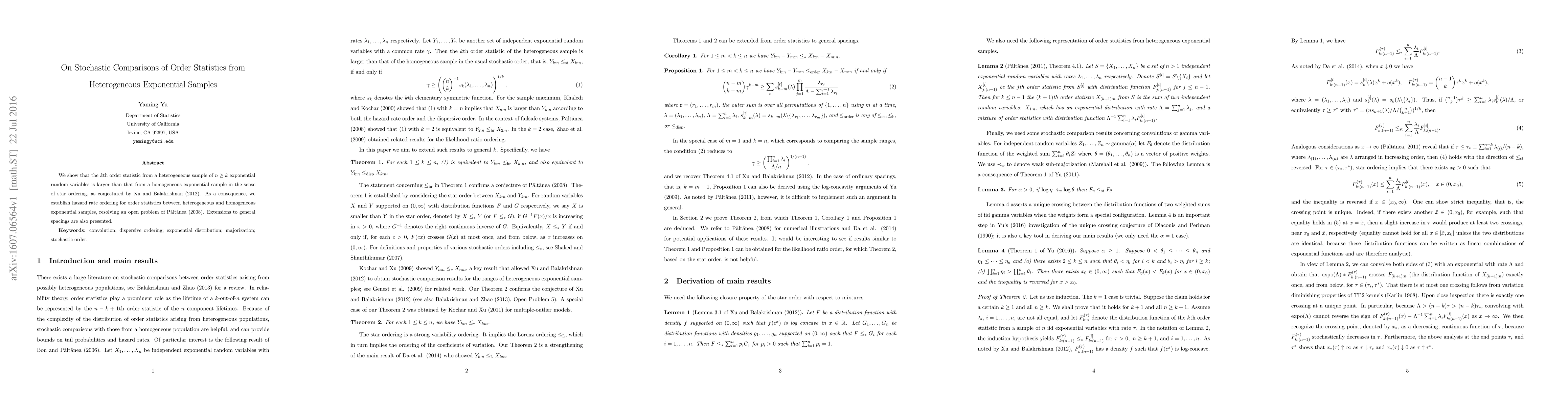 We show that the $k$th order statistic from a heterogeneous sample of $n\geq k$ exponential random variables is larger than that from a homogeneous exponential sample in the sense of star ordering, as conjectured by Xu and Balakrishnan (2012). As a consequence, we establish hazard rate ordering for order statistics between heterogeneous and homogeneous exponential samples, resolving an open problem of P\v{a}lt\v{a}nea (2008). Extensions to general spacings are also presented.