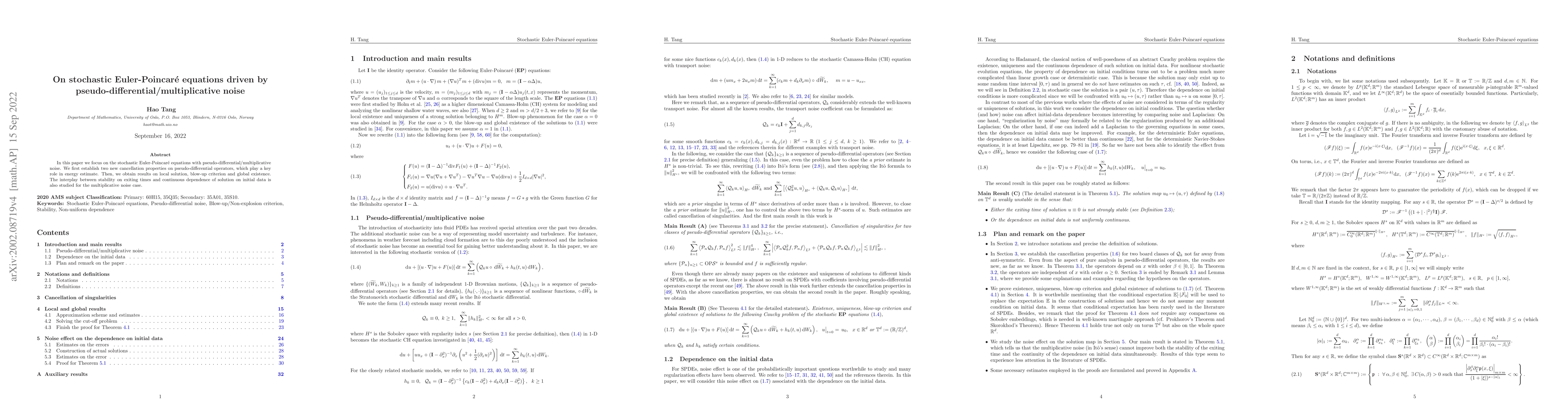 This paper investigates stochastic Euler-Poincaré equations influenced by pseudo-differential and multiplicative noise, establishing new cancellation properties for pseudo-differential operators to support energy estimates. It also explores local solutions, blow-up criteria, and global existence, along with stability and continuous dependence in the multiplicative noise context.