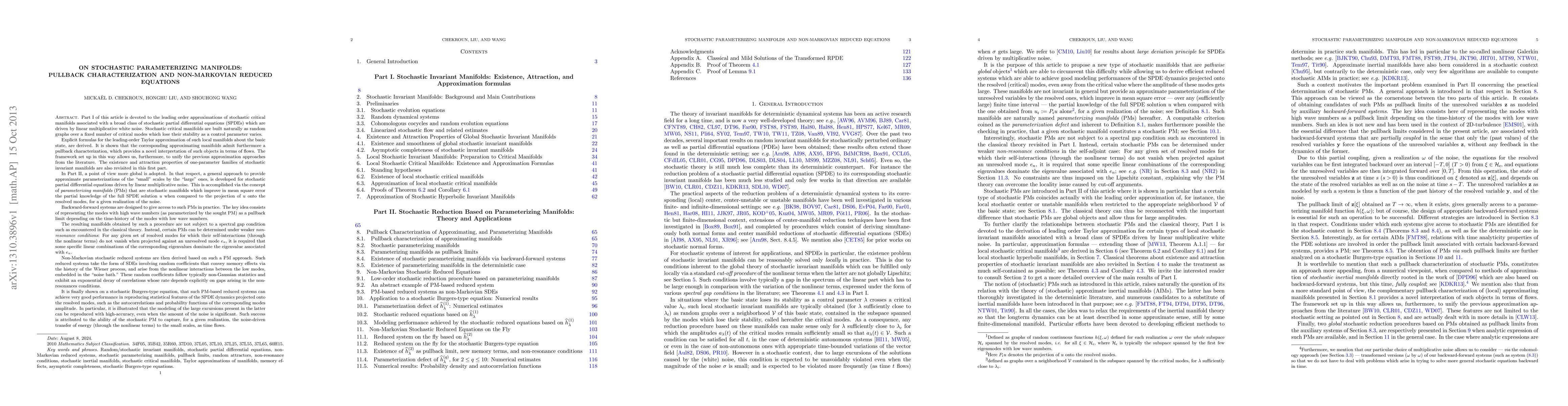 A general approach to provide approximate parameterizations of the "small" scales by the "large" ones, is developed for stochastic partial differential equations driven by linear multiplicative noise. This is accomplished via the concept of parameterizing manifolds (PMs) that are stochastic manifolds which improve in mean square error the partial knowledge of the full SPDE solution $u$ when compared to the projection of $u$ onto the resolved modes, for a given realization of the noise. Backward-forward systems are designed to give access to such PMs in practice. The key idea consists of representing the modes with high wave numbers (as parameterized by the sought PM) as a pullback limit depending on the time-history of the modes with low wave numbers. The resulting manifolds obtained by such a procedure are not subject to a spectral gap condition such as encountered in the classical theory. Instead, certain PMs can be determined under weaker non-resonance conditions. Non-Markovian stochastic reduced systems are then derived based on such a PM approach. Such reduced systems take the form of SDEs involving random coefficients that convey memory effects via the history of the Wiener process, and arise from the nonlinear interactions between the low modes, embedded in the "noise bath." These random coefficients follow typically non-Gaussian statistics and exhibit an exponential decay of correlations whose rate depends explicitly on gaps arising in the non-resonances conditions. It is shown on a stochastic Burgers-type equation, that such PM-based reduced systems can achieve very good performance in reproducing statistical features of the SPDE dynamics projected onto the resolved modes, such as the autocorrelations and probability functions of the corresponding modes amplitude.