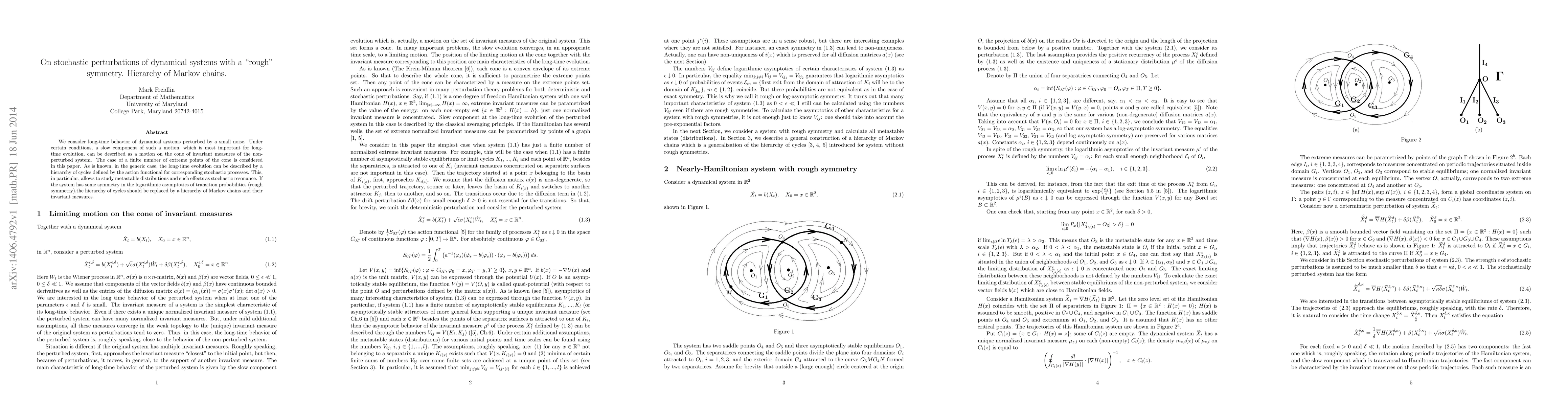 We consider long-time behavior of dynamical systems perturbed by a small noise. Under certain conditions, a slow component of such a motion, which is most important for long- time evolution, can be described as a motion on the cone of invariant measures of the non- perturbed system. The case of a finite number of extreme points of the cone is considered in this paper. As is known, in the generic case, the long-time evolution can be described by a hierarchy of cycles defined by the action functional for corresponding stochastic processes. This, in particular, allows to study metastable distributions and such effects as stochastic resonance. If the system has some symmetry in the logarithmic asymptotics of transition probabilities (rough symmetry),the hierarchy of cycles should be replaced by a hierarchy of Markov chains and their invariant measures.