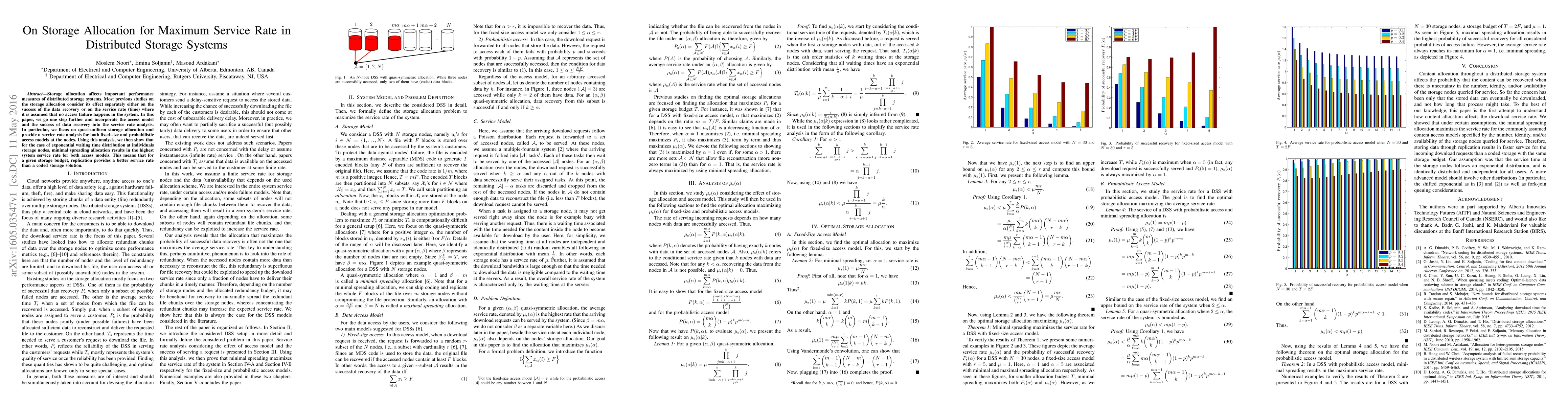 This paper examines storage allocation strategies in distributed storage systems, integrating access models and data recovery success into service rate analysis. It finds that minimal spreading allocation maximizes service rate under exponential waiting time distribution, indicating replication is preferable to coded storage for higher service rates.