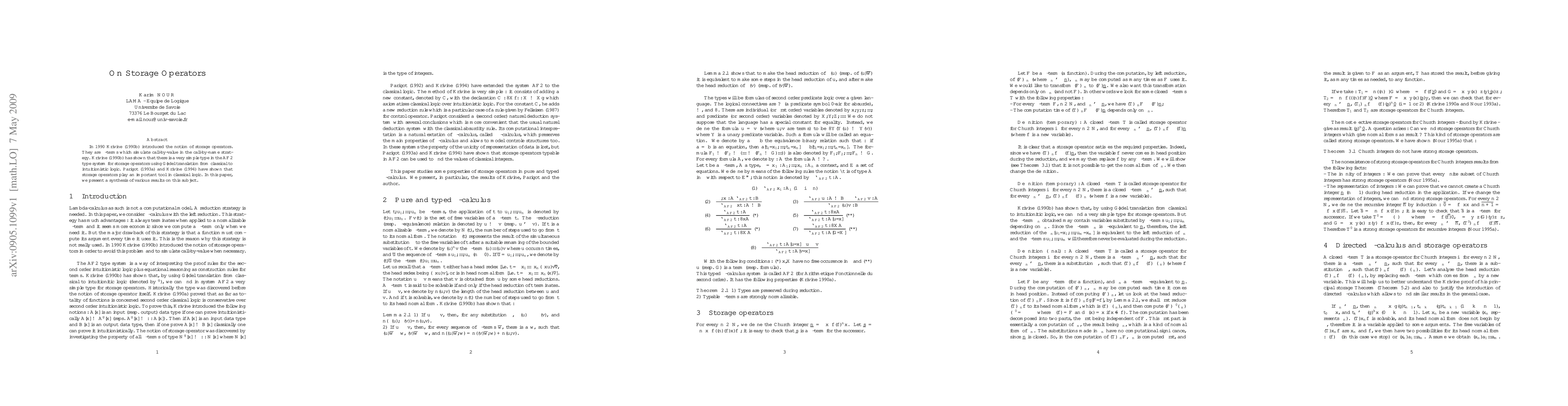 In 1990 Krivine introduced the notion of storage operators. They are $\lambda$-terms which simulate call-by-value in the call-by-name strategy. Krivine has shown that there is a very simple type in the AF2 type system for storage operators using G\"odel translation from classical to intuitionistic logic. Parigot and Krivine have shown that storage operators play an important tool in classical logic. In this paper, we present a synthesis of various results on this subject.