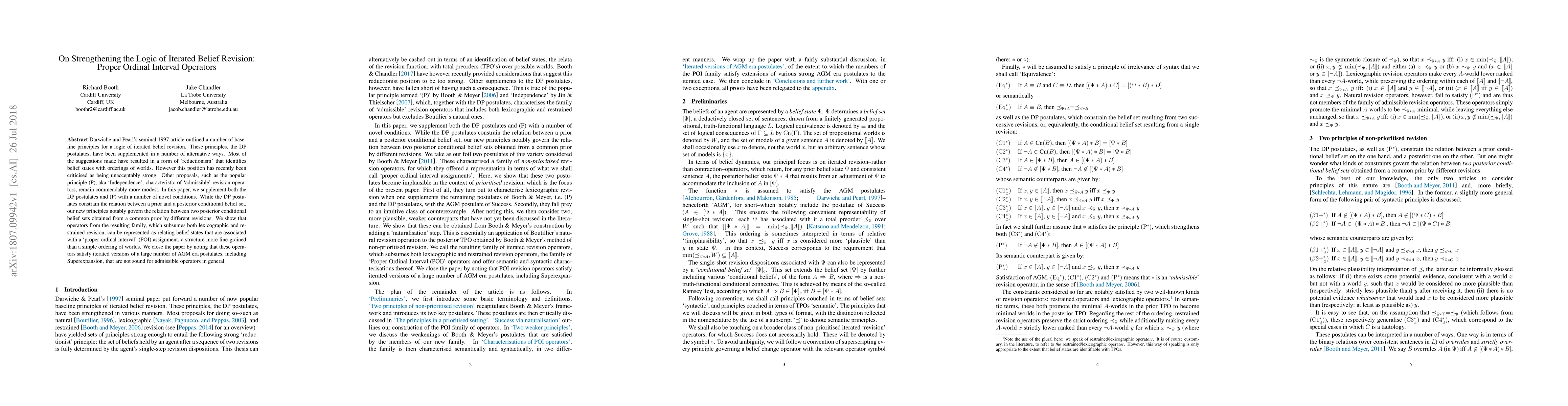 This paper introduces new conditions to strengthen the logic of iterated belief revision, supplementing Darwiche and Pearl's DP postulates and the principle (P). It proposes operators based on 'proper ordinal interval' assignments, which provide a more nuanced representation of belief states than simple world orderings, and demonstrates that these operators satisfy several AGM era postulates.