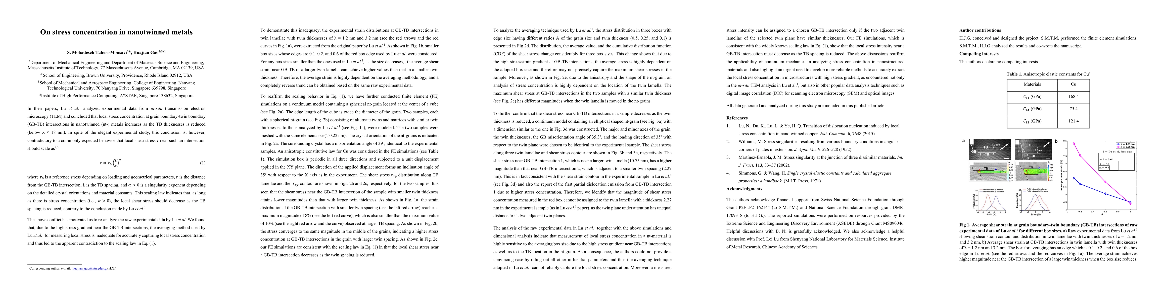 In their papers, Lu et al. analysed experimental data from in-situ transmission electron microscopy (TEM) and concluded that local stress concentration at grain boundary-twin boundary (GB-TB) intersections in nanotwinned (nt-) metals increases as the TB thicknesses is reduced (below ${\lambda}$ $\leq$ 18 nm). However, here, by analysing the raw experimental data in Lu et al. together with finite element simulations and dimensional analysis, we show that the measurement of local stress concentration in a nt-material is highly sensitive to the adopted averaging box size due to the high stress gradient near GB-TB intersections as well as to the TB location in the nt-grain. By careful analysis of the raw data, a completely reverse trend, which is consistent with well-established laws of continuum mechanics, can be captured.