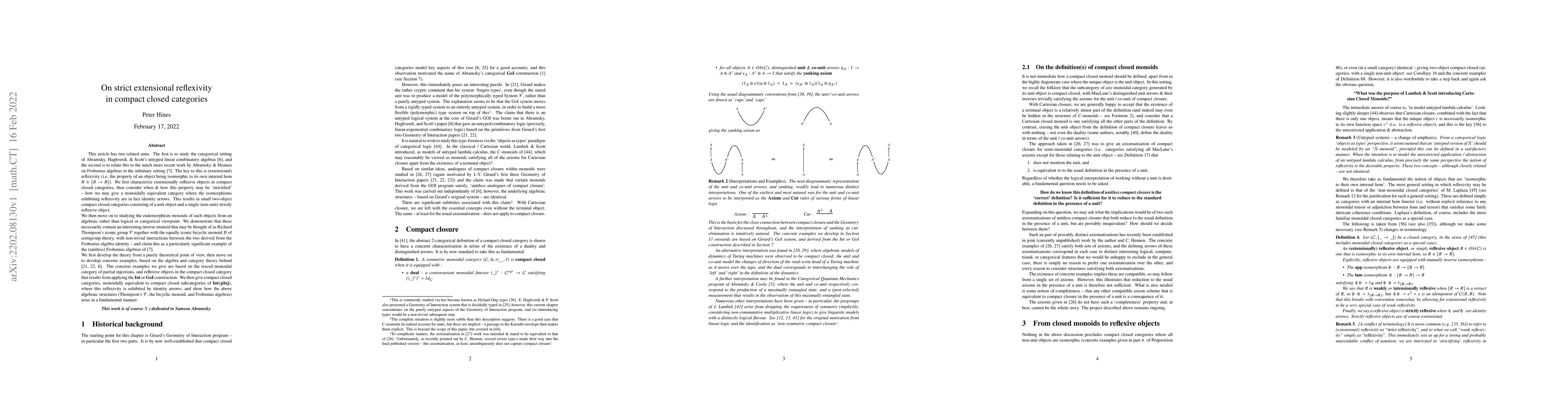 This paper investigates strict extensional reflexivity in compact closed categories, connecting Abramsky, Haghverdi, and Scott's untyped linear combinatory algebras to Abramsky and Heunen's work on Frobenius algebras. It characterizes strict extensional reflexivity, leading to monoidally equivalent categories where isomorphisms are identity arrows, resulting in a two-object structure with notable endomorphism monoids resembling Thompson's group F and the bicyclic monoid.
