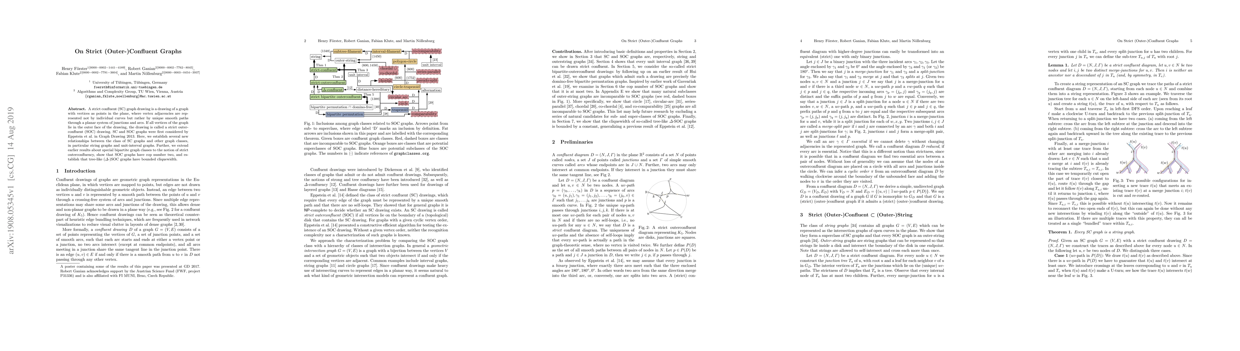 A strict confluent (SC) graph drawing is a drawing of a graph with vertices as points in the plane, where vertex adjacencies are represented not by individual curves but rather by unique smooth paths through a planar system of junctions and arcs. If all vertices of the graph lie in the outer face of the drawing, the drawing is called a strict outerconfluent (SOC) drawing. SC and SOC graphs were first considered by Eppstein et al. in Graph Drawing 2013. Here, we establish several new relationships between the class of SC graphs and other graph classes, in particular string graphs and unit-interval graphs. Further, we extend earlier results about special bipartite graph classes to the notion of strict outerconfluency, show that SOC graphs have cop number two, and establish that tree-like ($\Delta$-)SOC graphs have bounded cliquewidth.