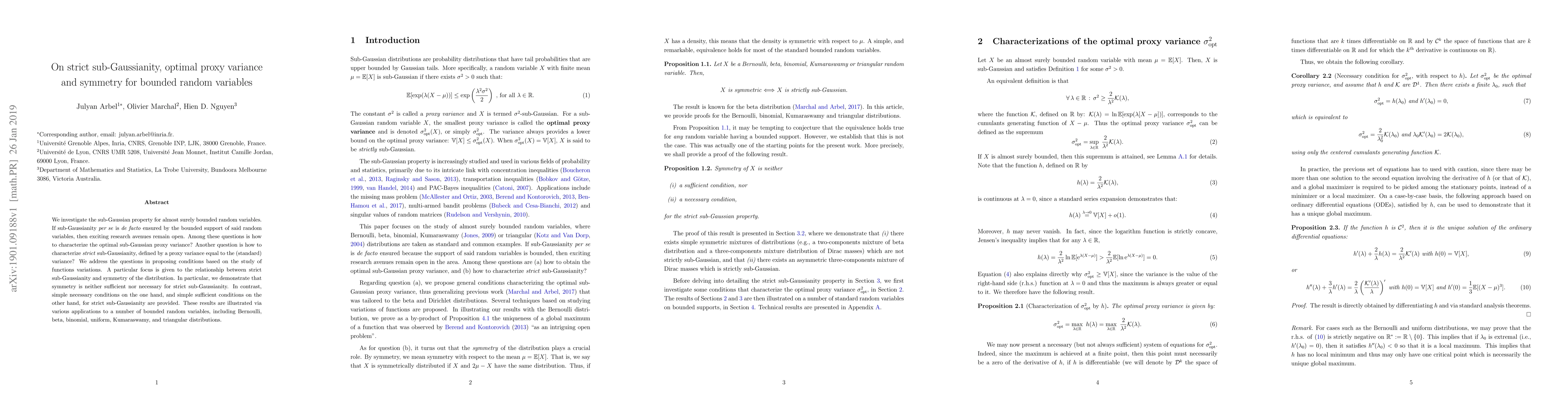 This paper explores sub-Gaussian properties for almost surely bounded random variables, focusing on characterizing optimal proxy variance and strict sub-Gaussianity. It demonstrates that symmetry is neither sufficient nor necessary for strict sub-Gaussianity, providing clear necessary and sufficient conditions for it, and illustrating these with examples from various bounded distributions.