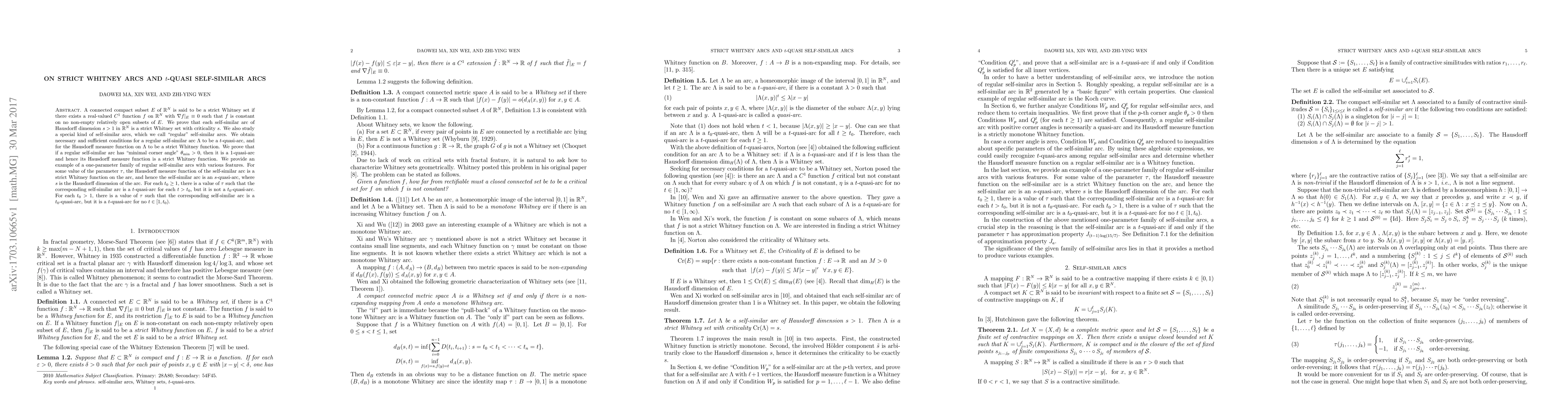 Research proves that self-similar arcs with Hausdorff dimension s > 1 in R^N are strict Whitney sets with criticality s, and provides conditions for regular self-similar arcs to be t-quasi-arc or have a strict Whitney measure function.