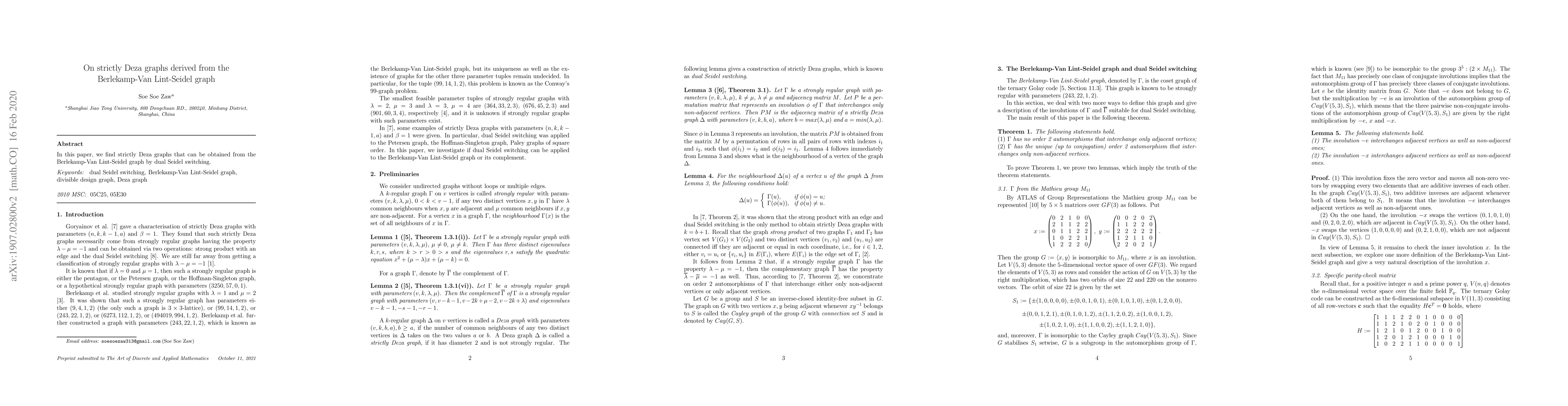 This paper identifies strictly Deza graphs derived from the Berlekamp-van Lint-Seidel graph through the application of dual Seidel switching. The study explores the structural properties and implications of these derived graphs.
