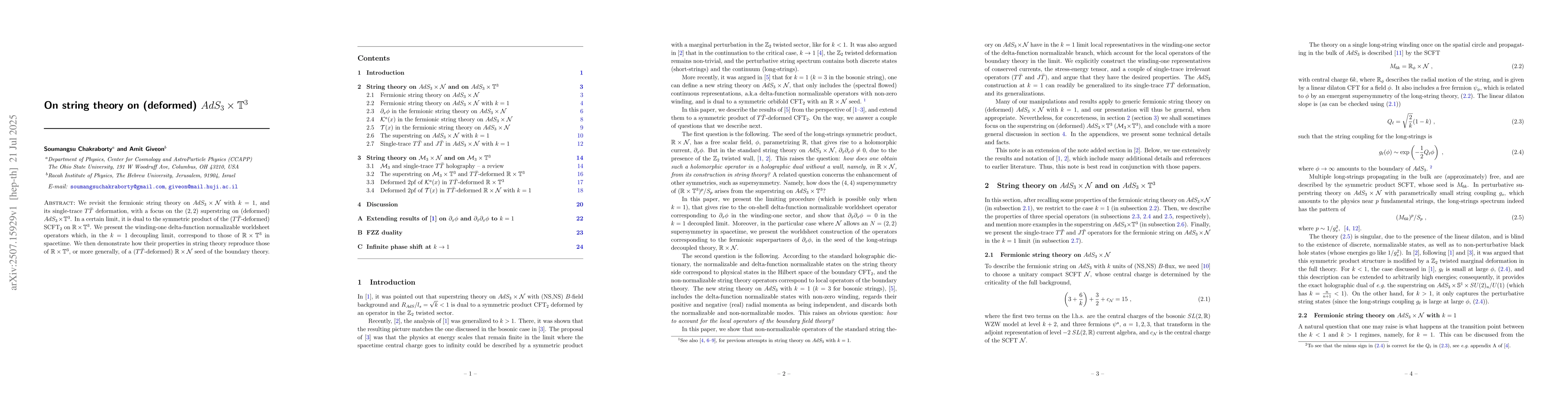 We revisit the fermionic string theory on $AdS_3\times \mathcal{N}$ with $k=1$, and its single-trace $T\bar T$ deformation, with a focus on the $(2,2)$ superstring on (deformed) $AdS_3\times \mathbb{T}^3$. In a certain limit, it is dual to the symmetric product of the ($T\bar T$-deformed) SCFT$_2$ on $\mathbb{R}\times \mathbb{T}^3$. We present the winding-one delta-function normalizable worldsheet operators which, in the $k=1$ decoupling limit, correspond to those of $\mathbb{R}\times \mathbb{T}^3$ in spacetime. We then demonstrate how their properties in string theory reproduce those of $\mathbb{R}\times\mathbb{T}^3$, or more generally, of a ($T\bar{T}$-deformed) $\mathbb{R}\times\mathcal{N}$ seed of the boundary theory.