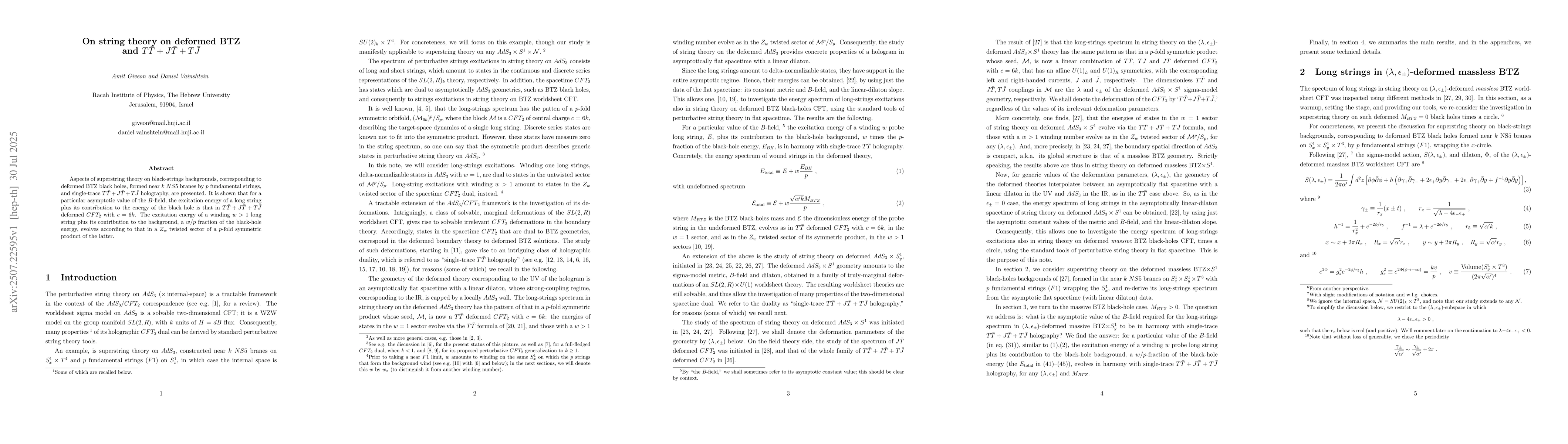 The paper presents detailed calculations and derivations of long-string excitation energies in deformed BTZ black hole backgrounds, linking them to T̄T + J̄T + T̄J deformed CFT2.