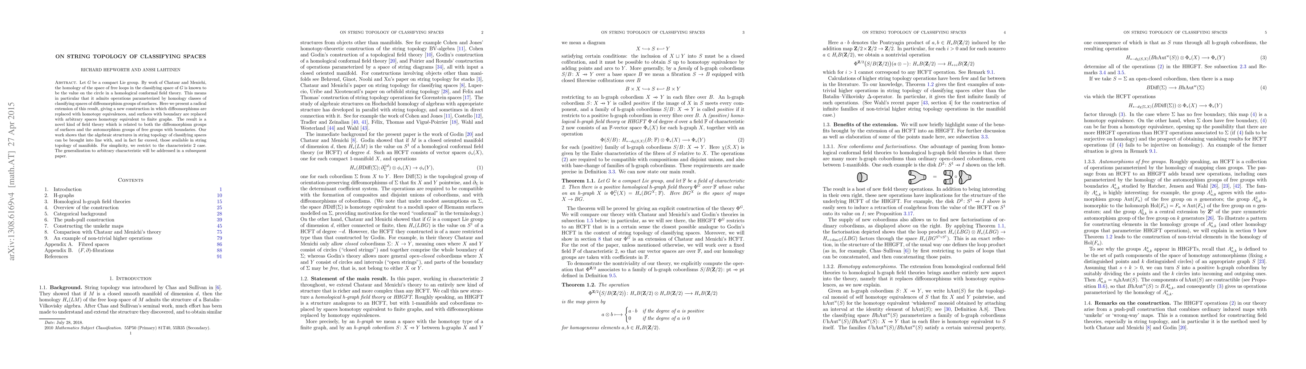 This paper extends the homology of free loop spaces in classifying spaces of compact Lie groups to homotopy equivalences and arbitrary spaces, constructing a new field theory related to diffeomorphism groups and automorphism groups of free groups. The study reveals enhanced algebraic structures in string topology of classifying spaces compared to manifolds, focusing initially on the characteristic 2 case.