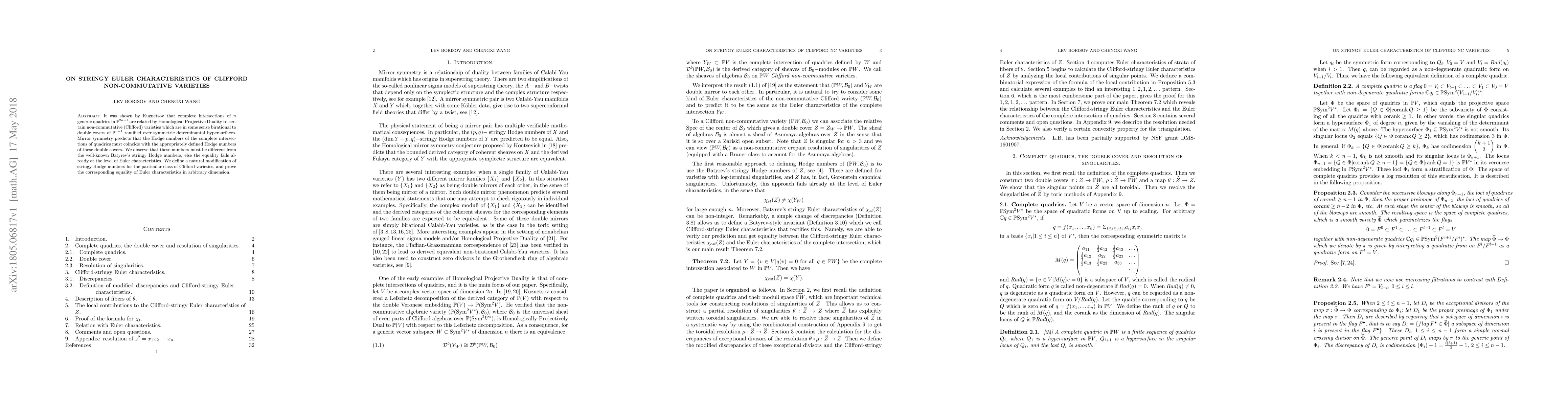 Kuznetsov demonstrated a relationship between intersections of generic quadrics and non-commutative Clifford varieties, challenging established Batyrev's stringy Hodge numbers. A modified version of stringy Hodge numbers is introduced, proving equality of Euler characteristics for these Clifford varieties in any dimension.