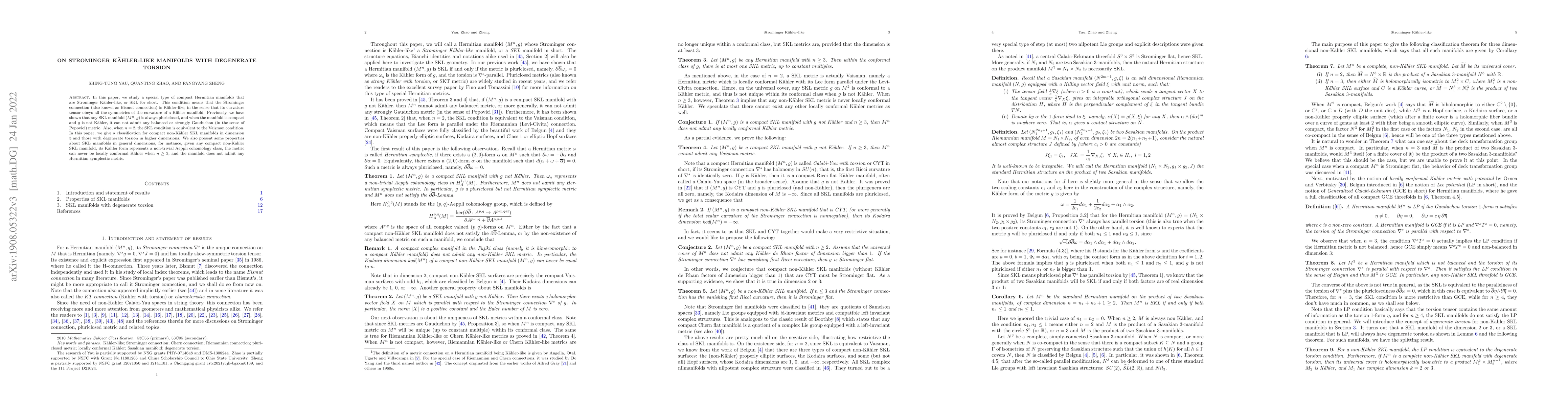 This paper classifies compact non-Kähler Strominger Kähler-like (SKL) manifolds in dimension 3 and those with degenerate torsion in higher dimensions. It also highlights general properties of SKL manifolds, including the non-triviality of the Kähler form in Aeppli cohomology and the incompatibility of locally conformal Kähler metrics for dimensions $n \geq 3$.