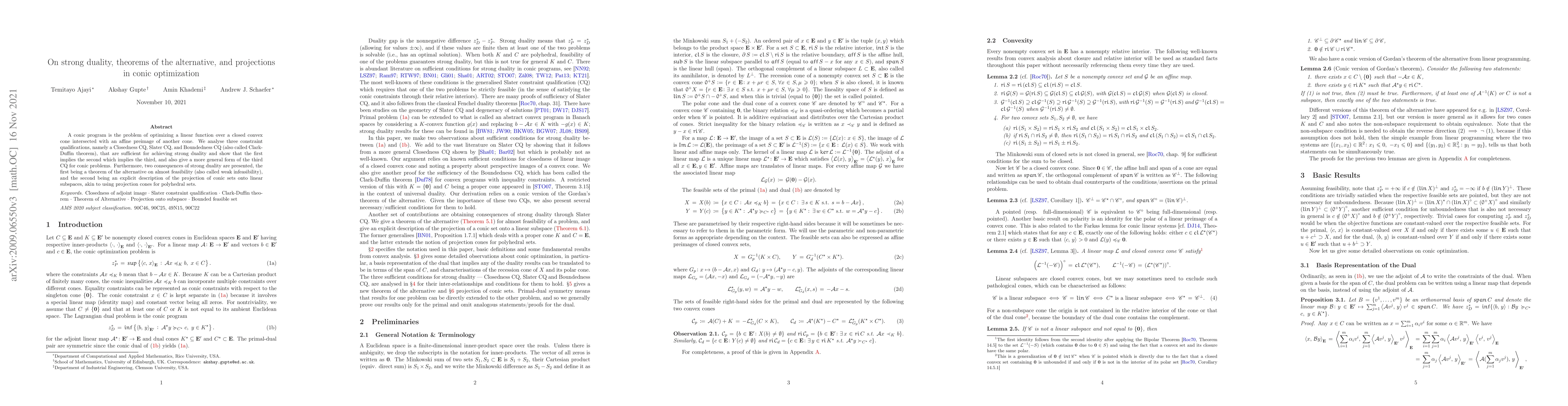 This paper examines constraint qualifications for strong duality in conic optimization, demonstrating the implications between Closedness, Slater, and Boundedness CQs. It also presents a theorem of the alternative for almost feasibility and describes the projection of conic sets onto linear subspaces.