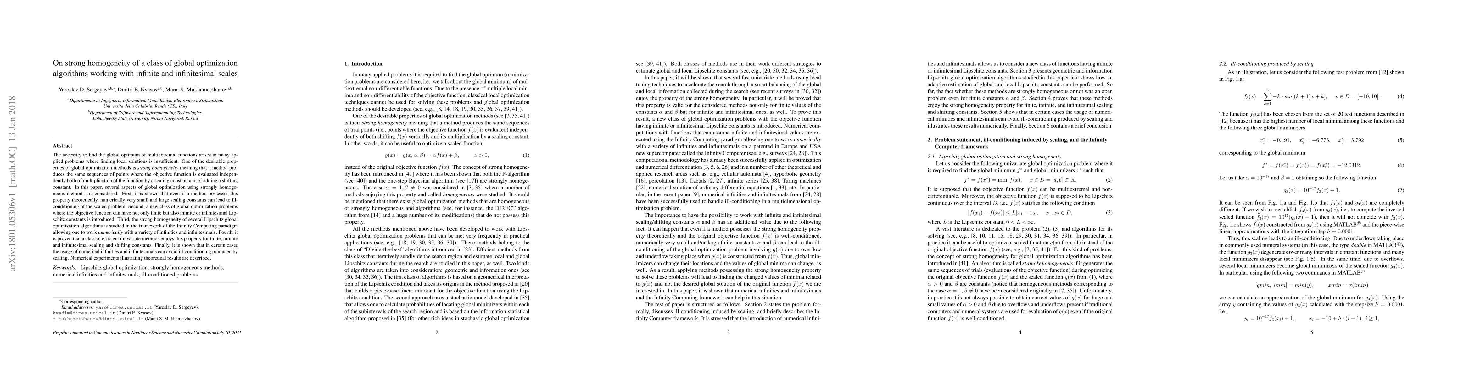 The necessity to find the global optimum of multiextremal functions arises in many applied problems where finding local solutions is insufficient. One of the desirable properties of global optimization methods is \emph{strong homogeneity} meaning that a method produces the same sequences of points where the objective function is evaluated independently both of multiplication of the function by a scaling constant and of adding a shifting constant. In this paper, several aspects of global optimization using strongly homogeneous methods are considered. First, it is shown that even if a method possesses this property theoretically, numerically very small and large scaling constants can lead to ill-conditioning of the scaled problem. Second, a new class of global optimization problems where the objective function can have not only finite but also infinite or infinitesimal Lipschitz constants is introduced. Third, the strong homogeneity of several Lipschitz global optimization algorithms is studied in the framework of the Infinity Computing paradigm allowing one to work \emph{numerically} with a variety of infinities and infinitesimals. Fourth, it is proved that a class of efficient univariate methods enjoys this property for finite, infinite and infinitesimal scaling and shifting constants. Finally, it is shown that in certain cases the usage of numerical infinities and infinitesimals can avoid ill-conditioning produced by scaling. Numerical experiments illustrating theoretical results are described.