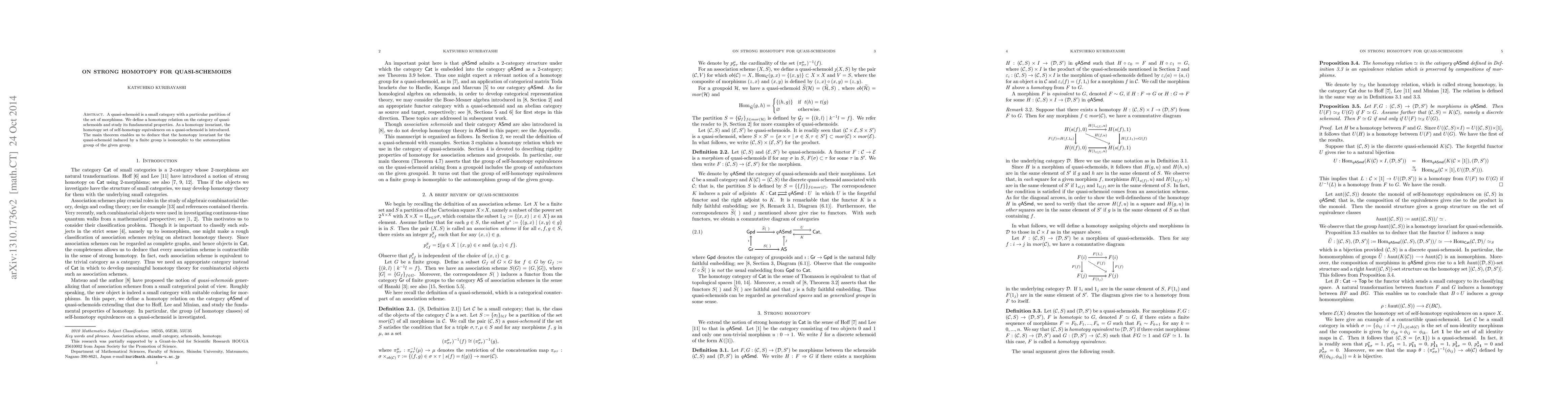A quasi-schemoid is a small category with a particular partition of the set of morphisms. We define a homotopy relation on the category of quasi-schemoids and study its fundamental properties. As a homotopy invariant, the homotopy set of self-homotopy equivalences on a quasi-schemoid is introduced. The main theorem enables us to deduce that the homotopy invariant for the quasi-schemoid induced by a finite group is isomorphic to the automorphism group of the given group.