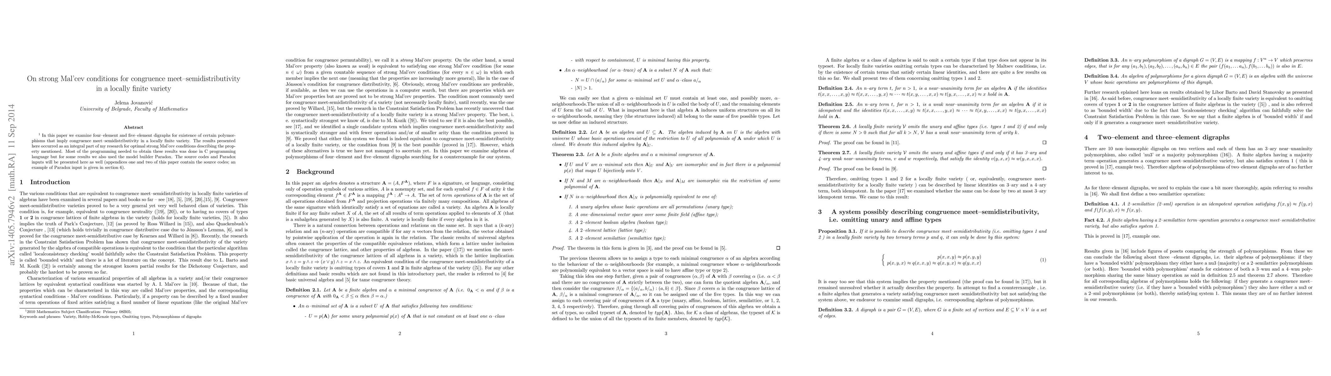 In this paper we examine four-element and five-element digraphs for existence of certain polymorphisms that imply congruence meet-semidistributivity in a locally finite variety. The results presented here occurred as an integral part of my research for optimal strong Mal'cev conditions describing the property mentioned. Most of the programming needed to obtain these results was done in C programming language but for some results we also used the model builder Paradox. The source codes and Paradox inputs will be presented here as well (appendices one and two of this paper contain the source codes; an example of Paradox input is given in section 6).