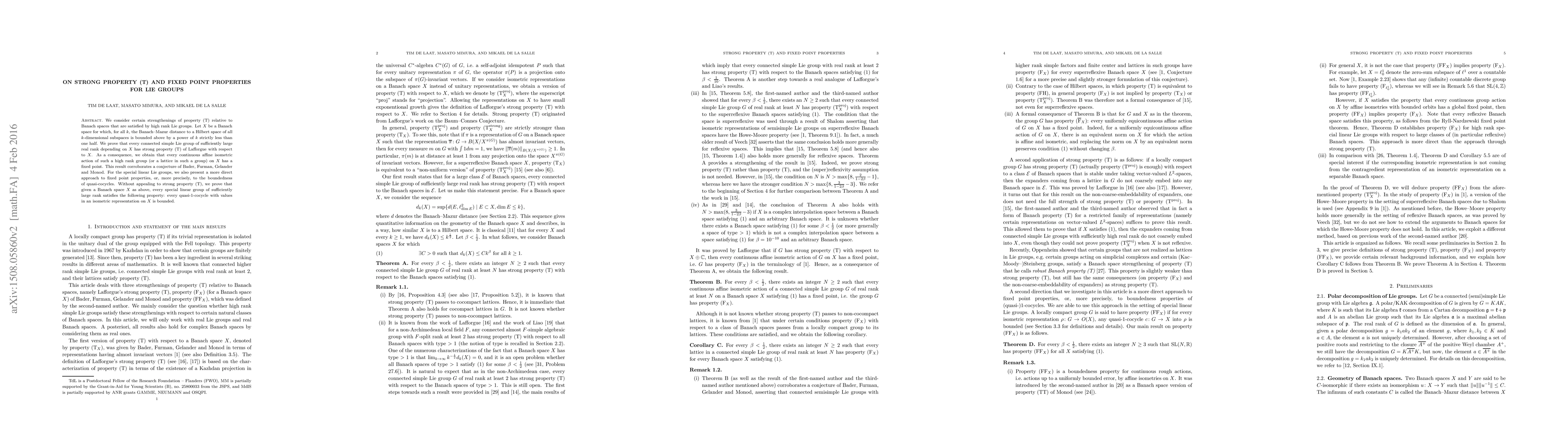 This paper establishes that high rank Lie groups possess a strong version of property (T) for specific Banach spaces, leading to fixed points in their continuous affine isometric actions. It also presents an alternative method to prove boundedness of quasi-cocycles for special linear Lie groups without relying on strong property (T).
