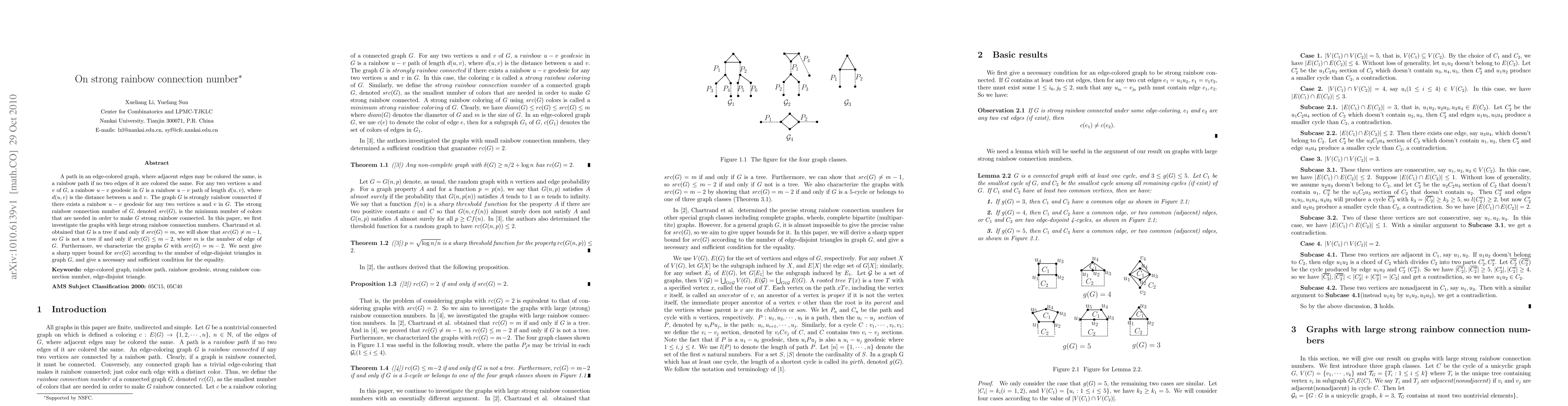 The paper investigates strong rainbow connection in edge-colored graphs, defining strong rainbow connection and introducing the strong rainbow connection number (src(G)) as the minimum colors needed for strong rainbow connection.