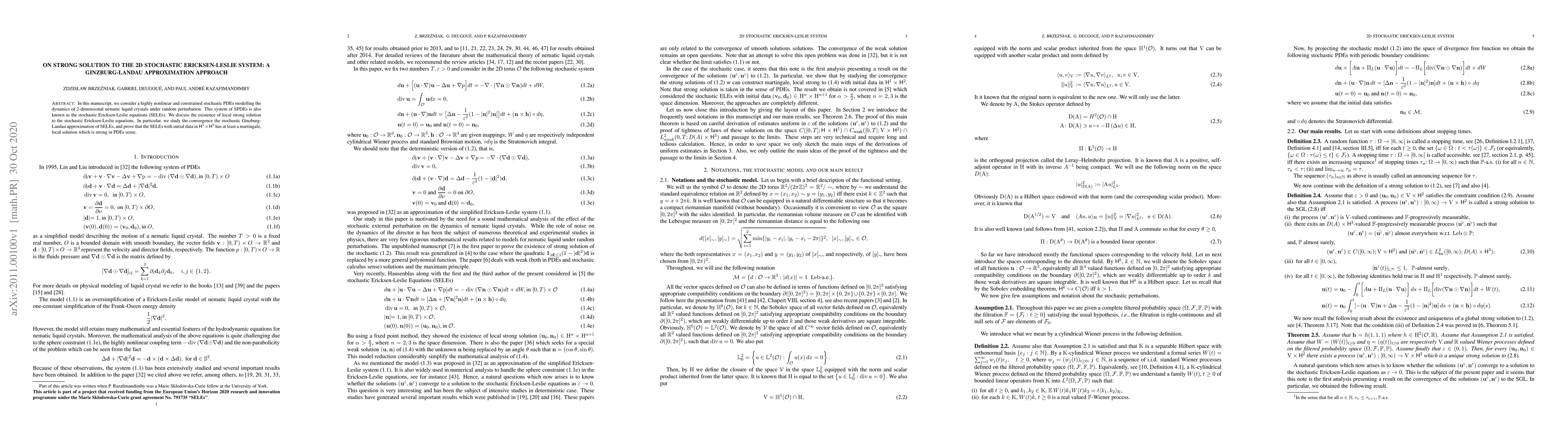 In this manuscript, we consider a highly nonlinear and constrained stochastic PDEs modelling the dynamics of 2-dimensional nematic liquid crystals under random perturbation. This system of SPDEs is also known as the stochastic Ericksen-Leslie equations (SELEs). We discuss the existence of local strong solution to the stochastic Ericksen-Leslie equations. In particular, we study the convergence the stochastic Ginzburg-Landau approximation of SELEs, and prove that the SELEs with initial data in $\sh^1\times \sh^2$ has at least a martingale, local solution which is strong in PDEs sense.